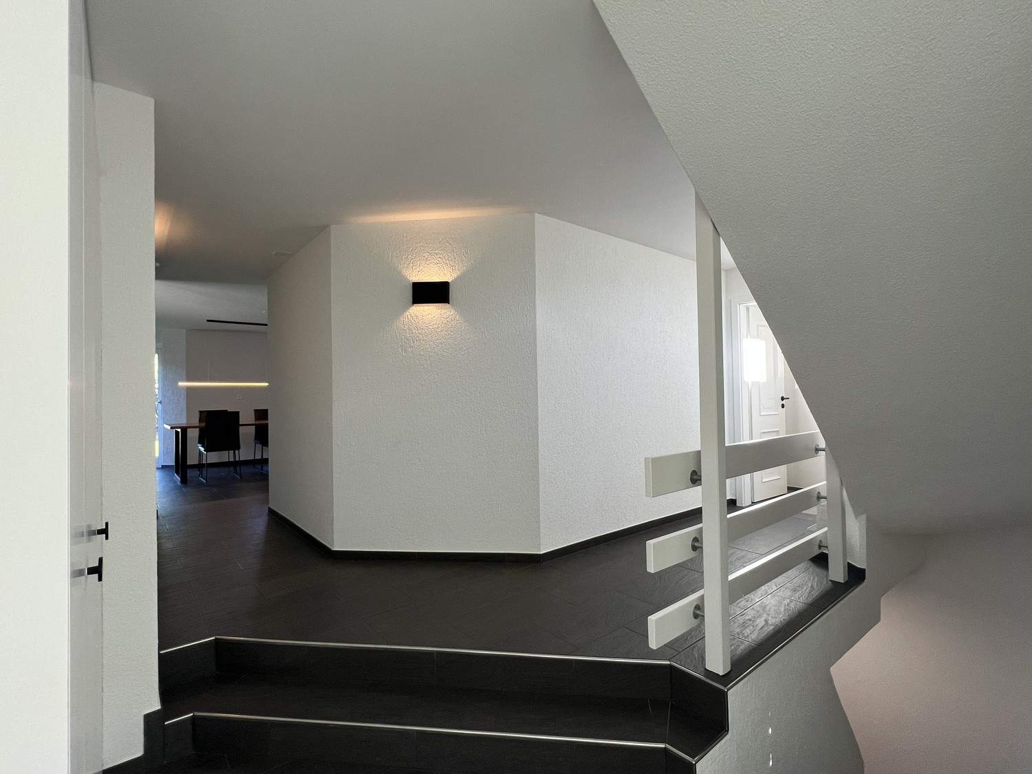 Der offene Küchen-/Wohn-/Essbereich mit edlem Plattenboden schafft ein grosszügiges und einladendes Ambiente. Die moderne Küche mit Steamer und Kombi Steamer bietet viel Stauraum. Der Küchen- und Essbereich ist mit der integrierten Kochinsel ideal dafür geeignet, sich beim Kochen zu treffen und auszutauschen. Ergänzt wird das Geschoss durch ein Büro, Gäste oder Hobbyzimmer (15 m²). Ein separates Gäste WC, sowie einen einladenden Eingangsbereich mit Einbauschränken runden das Erdgeschoss ab.