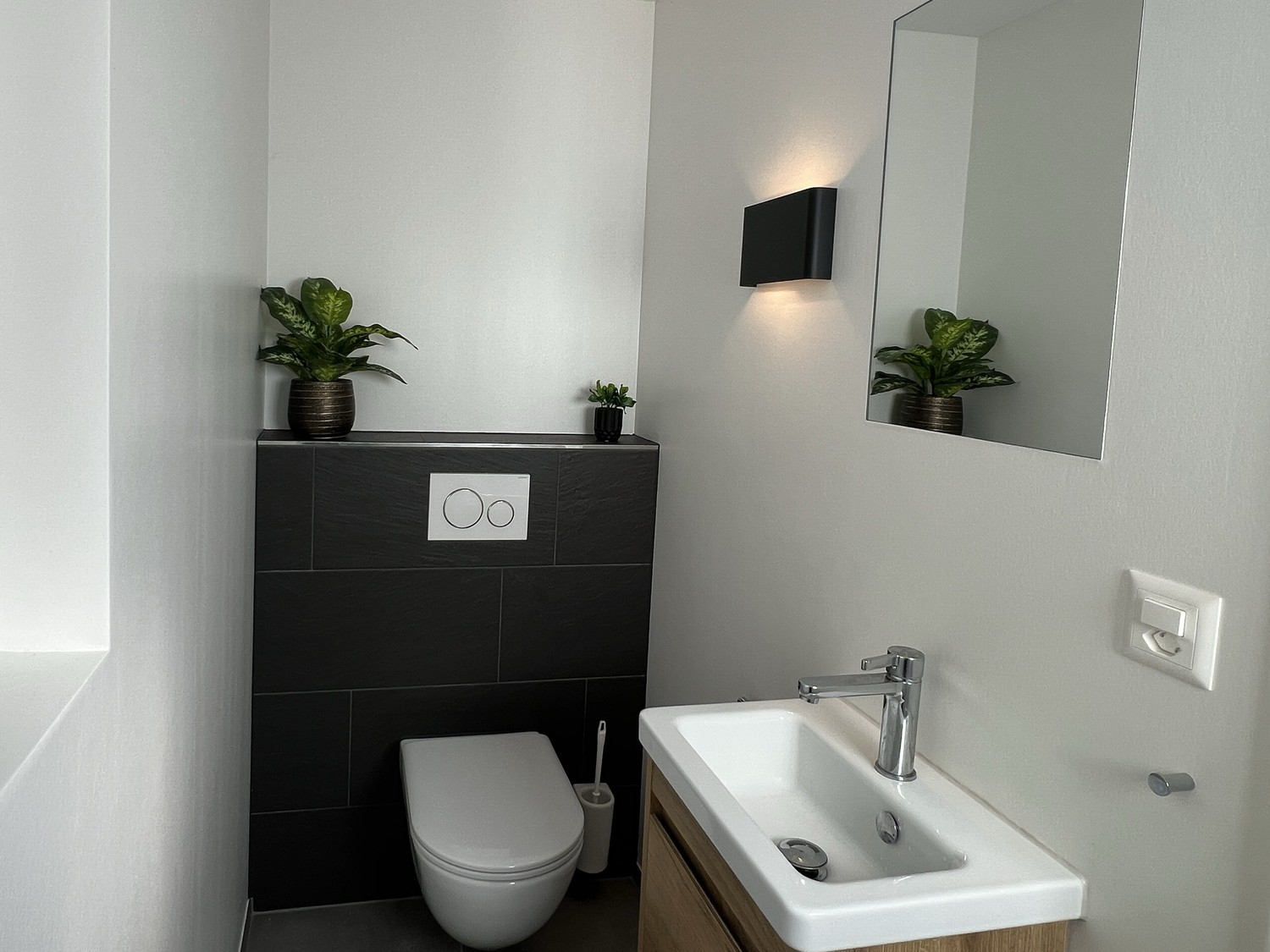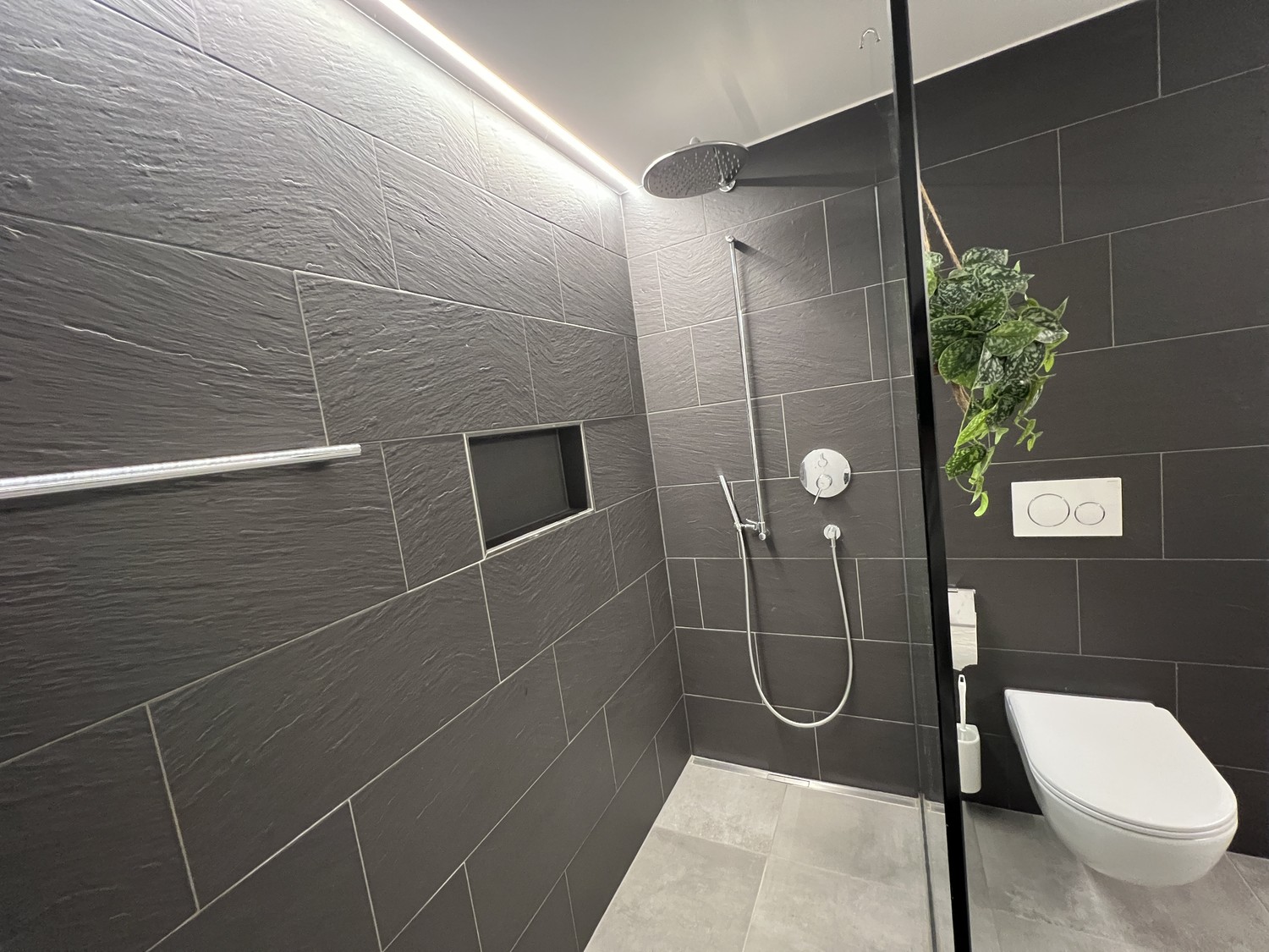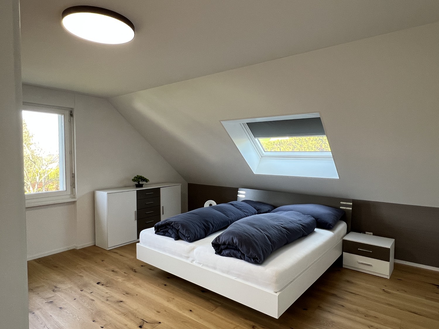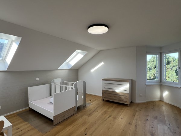 Im oberen Stockwerk befinden sich drei helle und grosse Zimmer (22/21/17 m²) mit hochwertigem Eichenparkett, die Ruhe und Rückzug ermöglichen. Das Badezimmer ist mit einer Badewanne und einer begehbaren Regendusche ausgestattet und bietet ein elegantes Spa-Erlebnis im Alltag.