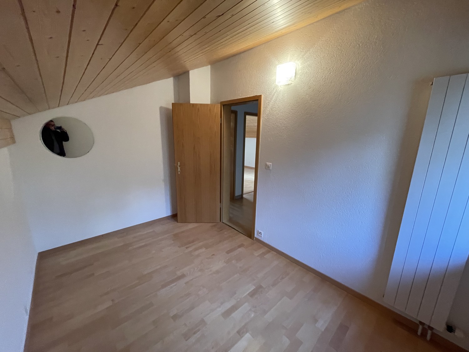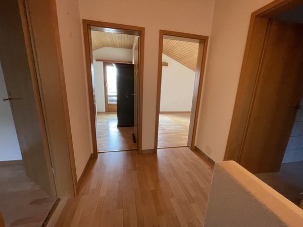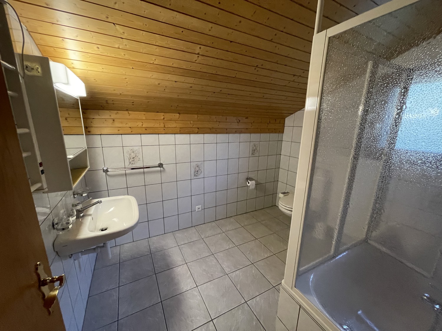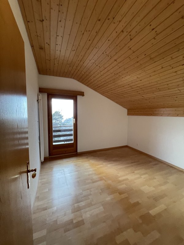 Das obere Geschoss ist mit einer Treppe sowie einem Treppenlift erschlossen. In diesem Geschoss befinden sich drei Schlafzimmer und ein Badezimmer mit WC und Badewanne. Auch hier kann die Aussicht auf dem grosszügigen Balkon genossen werden.