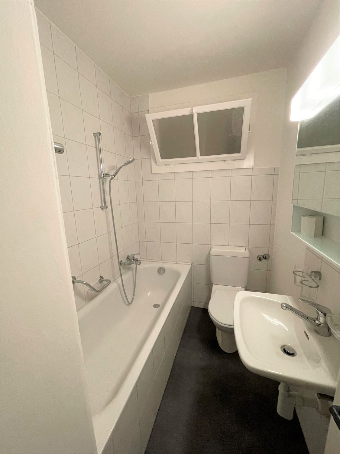 Das Badezimmer verfügt über eine Badewanne, ein WC und ein Spiegelschrank.