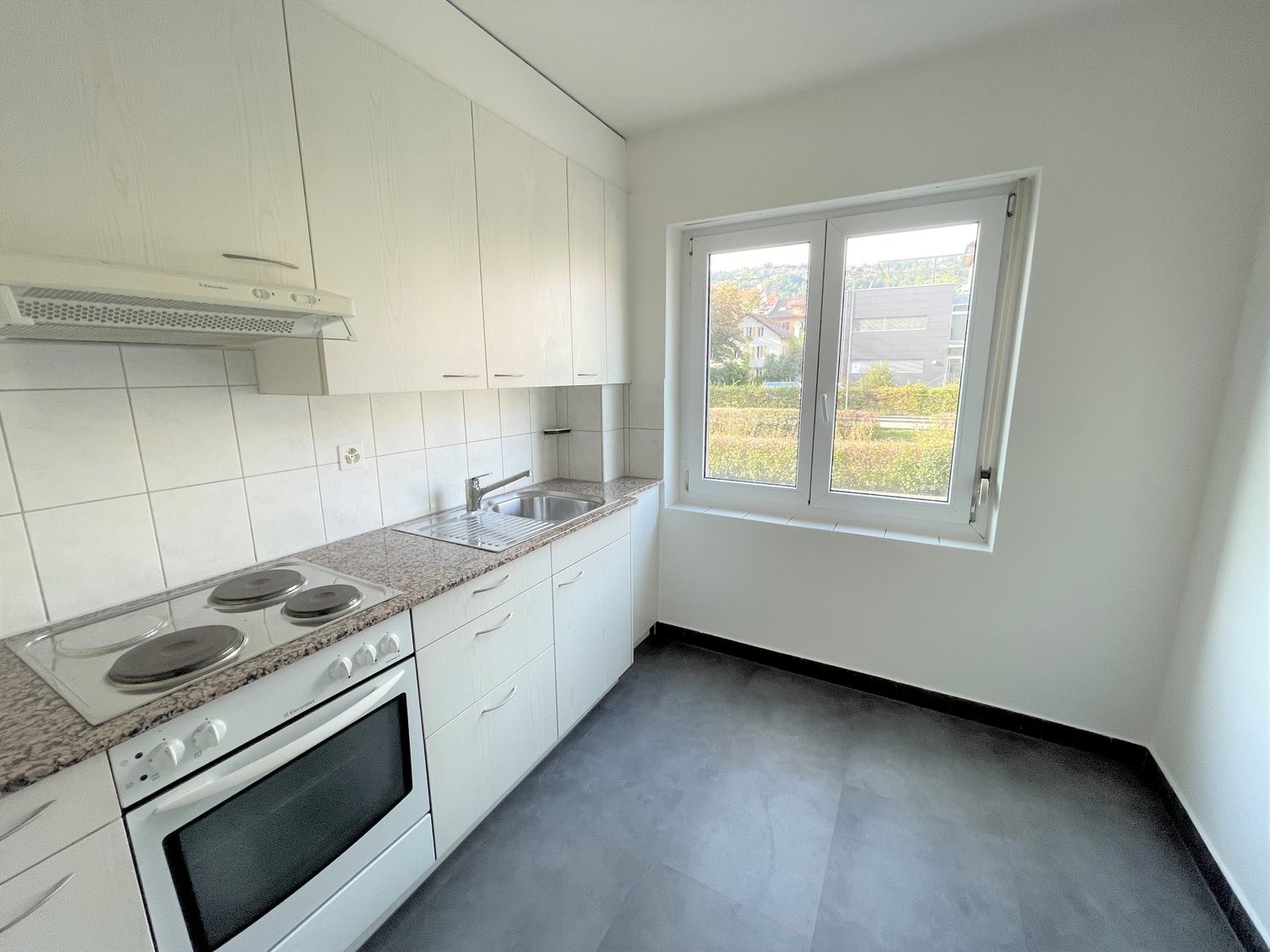 Die Küche verfügt über eine moderne Granitabdeckung und einen Plattenboden, wie auch das Badezimmer. Im Wohn- und Schlafzimmer wurde ein pflegeleichter Laminatboden verlegt.