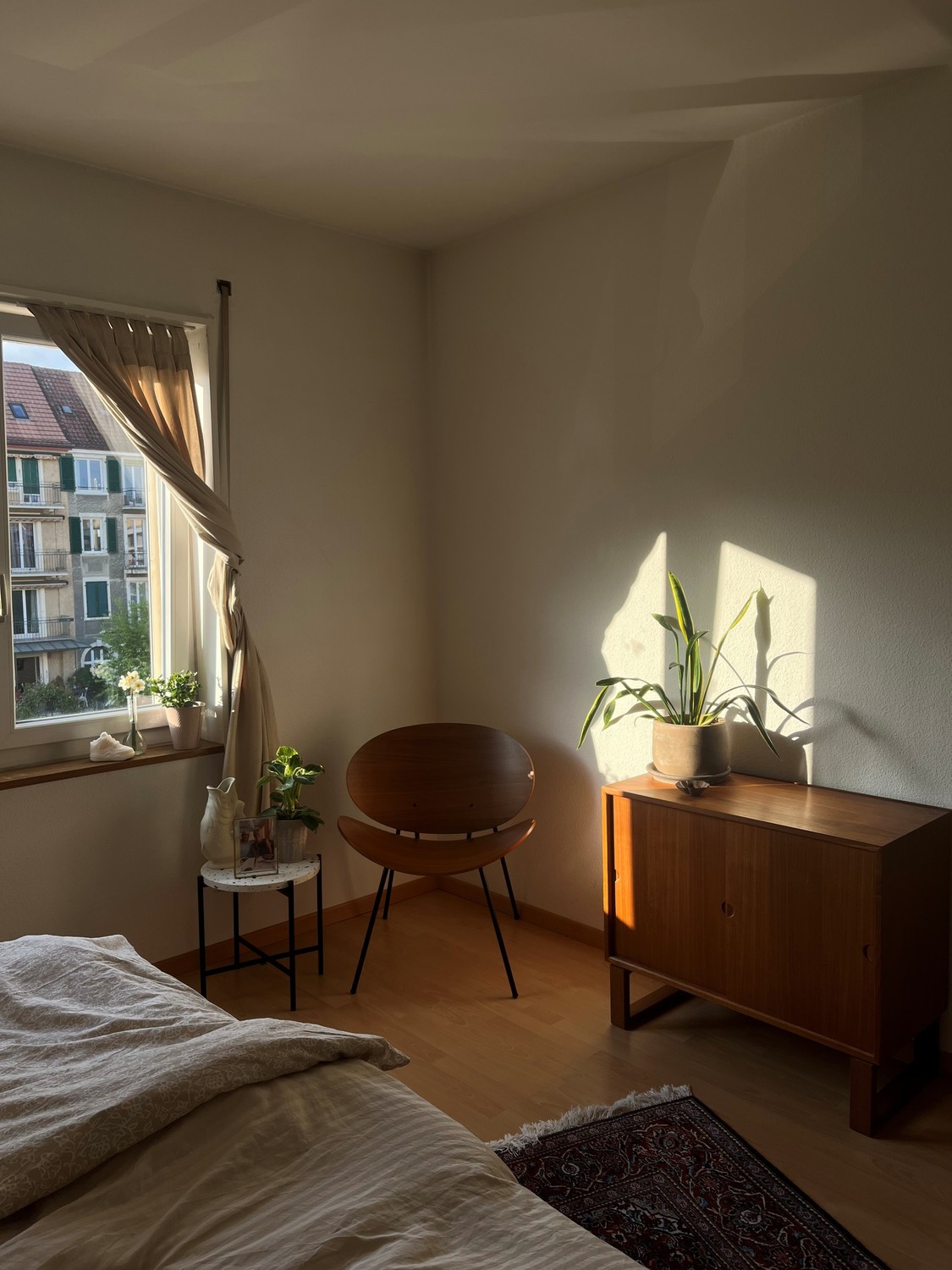Gemütliches Schlafzimmer: Ruhiger Rückzugsort mit Holzboden und natürlichem Licht