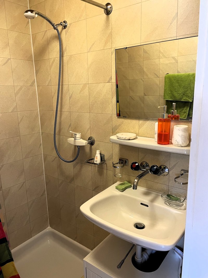 Das Zimmer hat eine Küche mit Kühlschrank,zwei Herdplatten, sowie einem Bad mit Dusche, WC und Lavabo. Eine Waschmaschine und Tumbler stehen zur Mitbenutzung bereit. Kellerabteil ist ebenfalls inkl.
