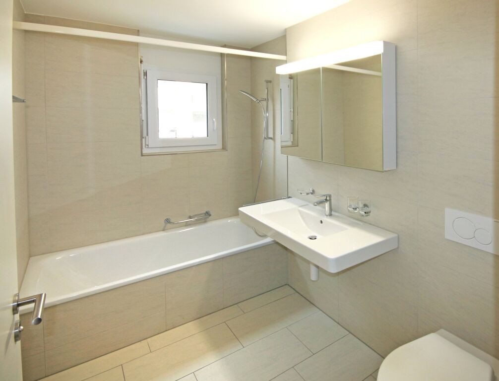 Moderne Badezimmer: Ein Badezimmer ist mit Badewanne, Lavabo, Spiegelschrank und WC ausgestattet - das zweite Badezimmer mit Lavabo, Spiegelschrank, WC sowie eigenem Waschturm