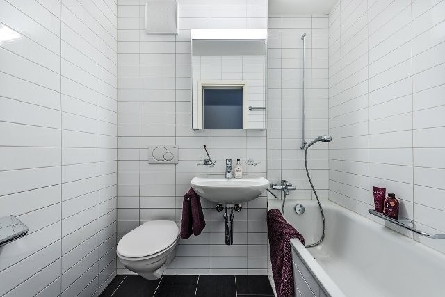 - Badezimmer mit WC, Lavabo, Spiegelschrank und Badewanne