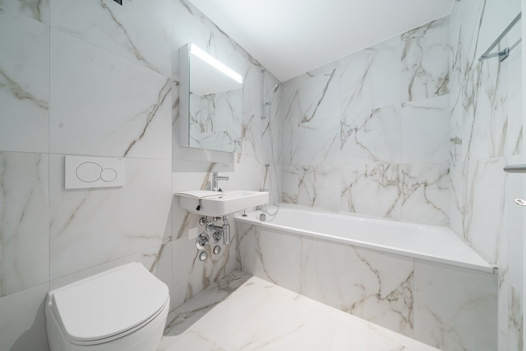 Wände in den Nasszellen 30/60 Keramische/Feinsteinzeug Wandplatten bis Unterkante Decke in braun-matt