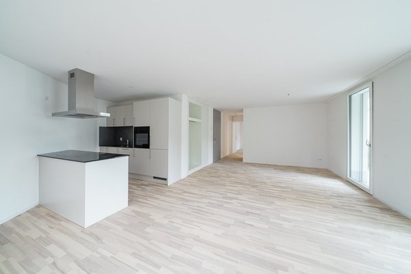 Wohnbereiche, Schlafzimmer und Küche mit Eichenparkett Boden, die Wände sind weiss gestrichen