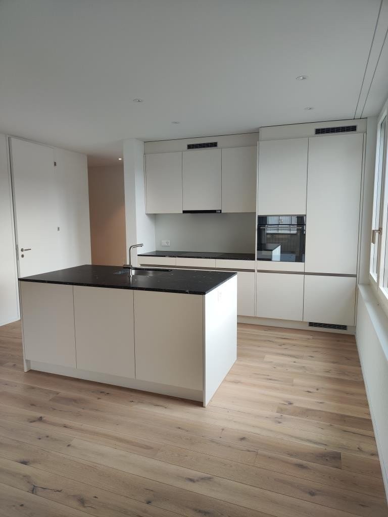 - offene Küche mit hochwertigen Küchengeräten (Kochfeld, Dampfabzug, Backofen mit integriertem Steamer, Kühlschrank mit separatem Tiefkühlteil, Geschirrspüler)