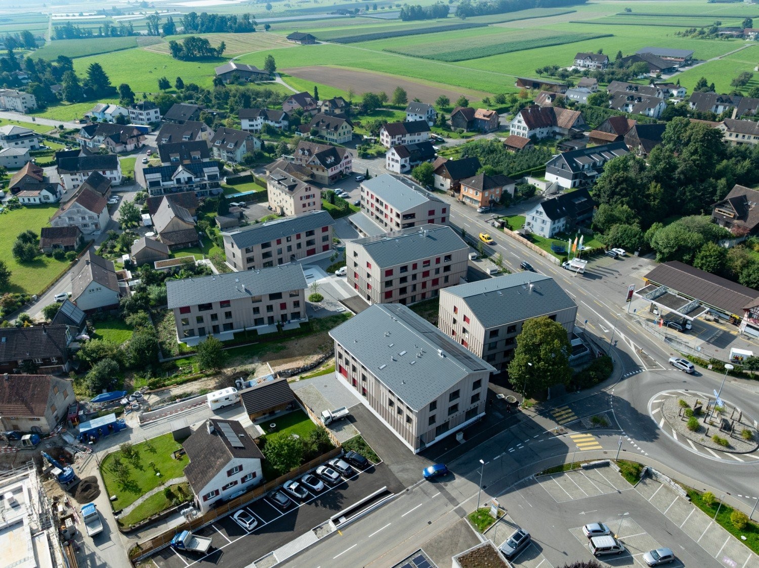 Die Gebäude werden mittels Fernwärme beheizt. Die Wärmeverteilung erfolgt über eine Fussbodenheizung mit Raumthermostaten zur individuellen Regulierung. Durch die grosszügige Photovoltaik-Anlage auf dem Dach reduzieren sich die Kosten für Allgemein- und Wohnungsstrom.