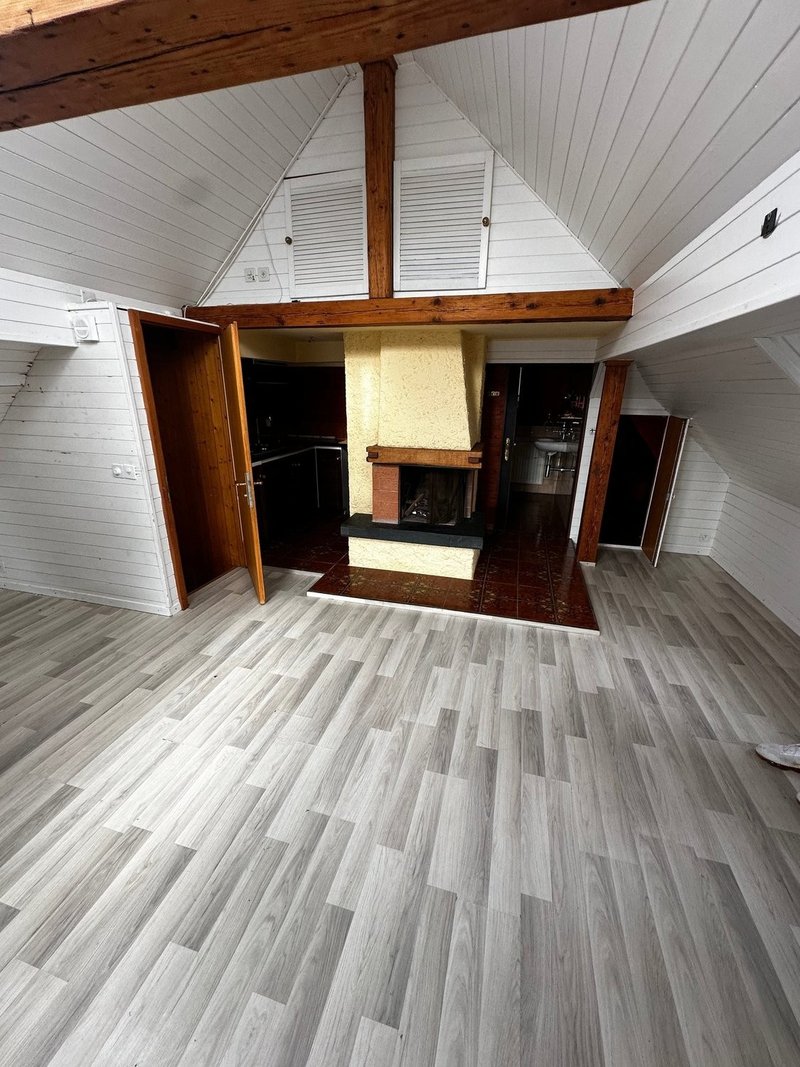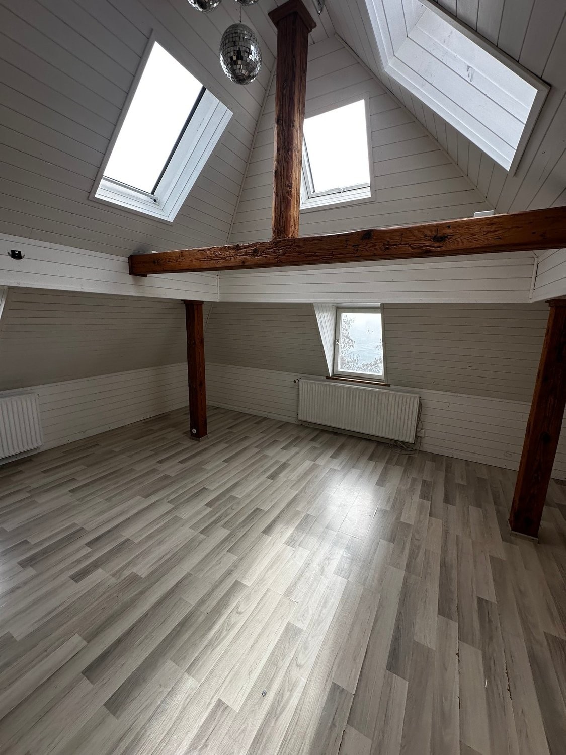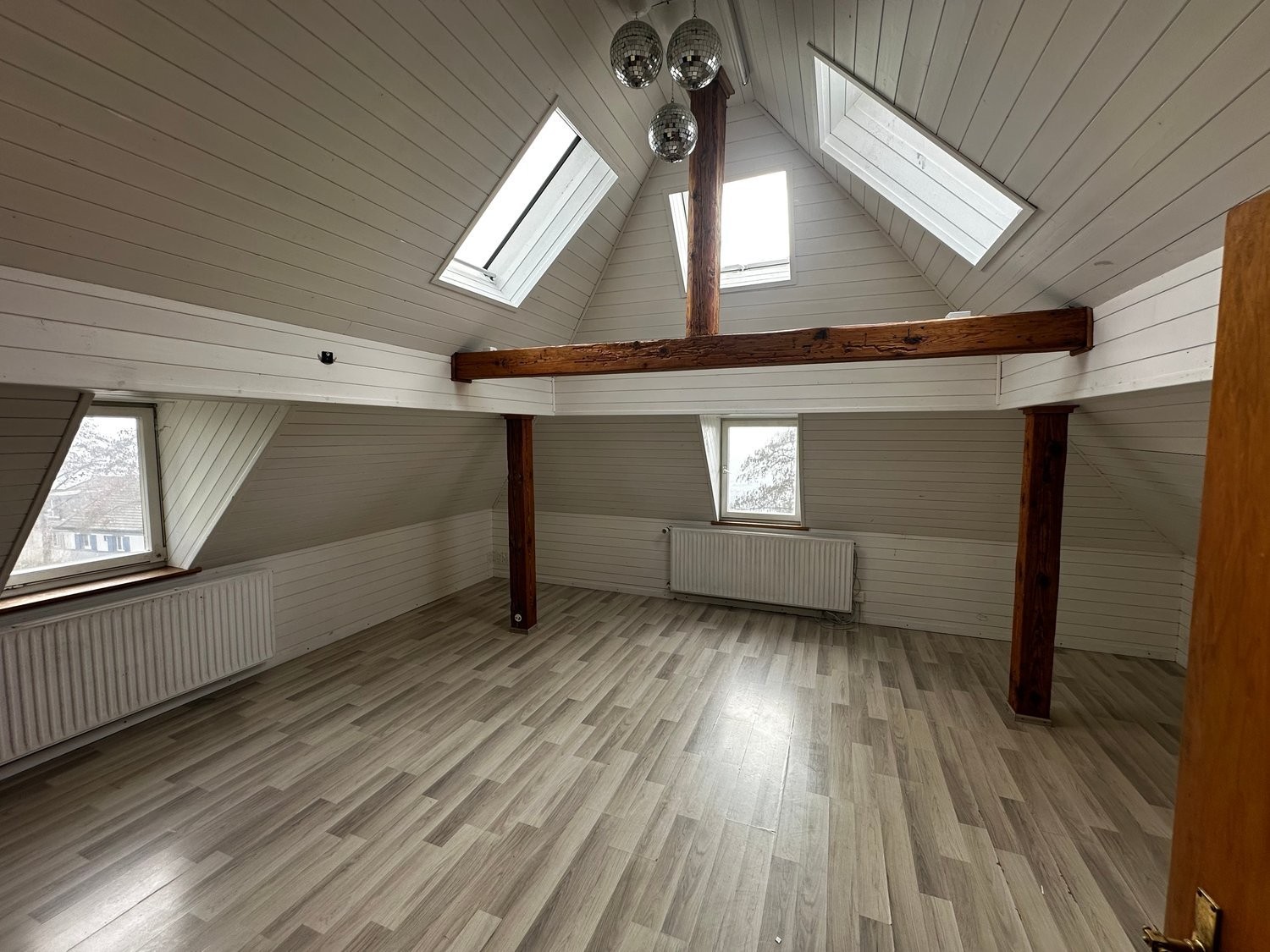 Authentischer Altbau-Charme: Sichtbare Holzbalken, Holzböden und helle Wandverkleidungen schaffen eine warme und einladende Atmosphäre