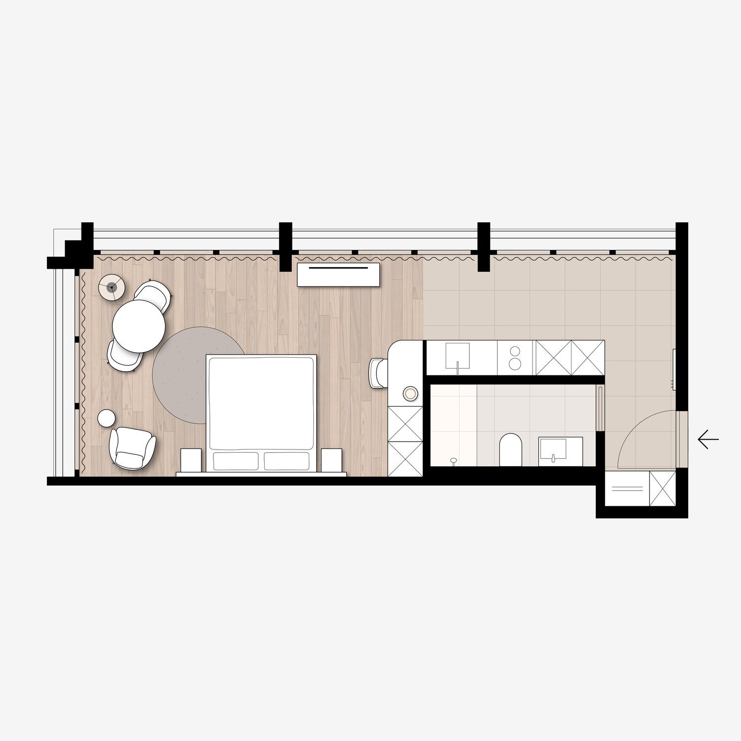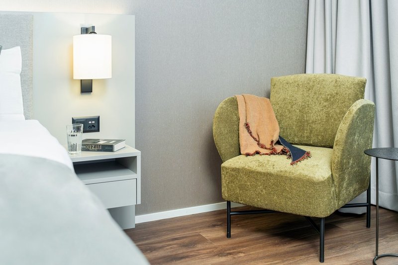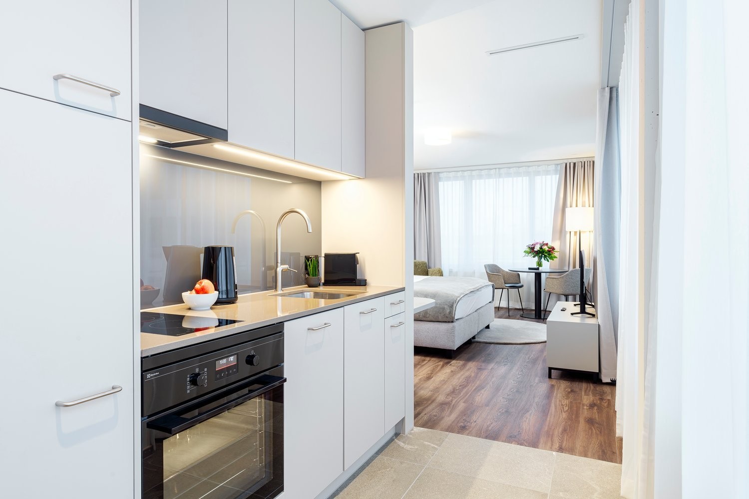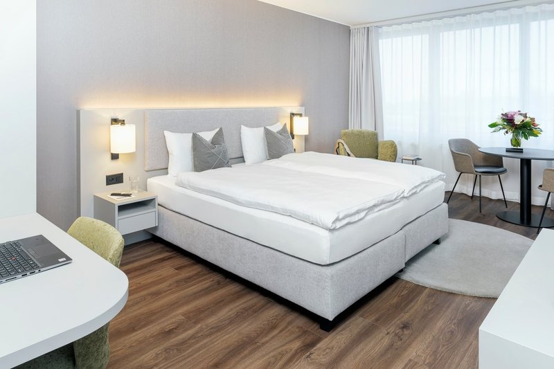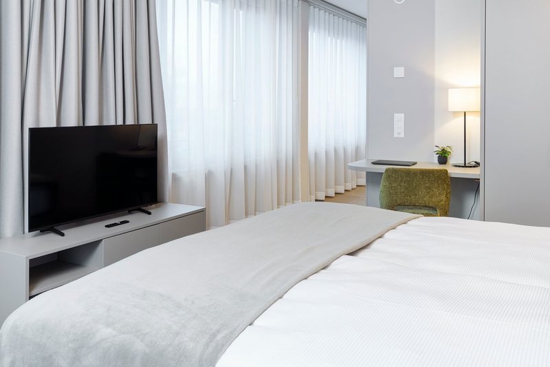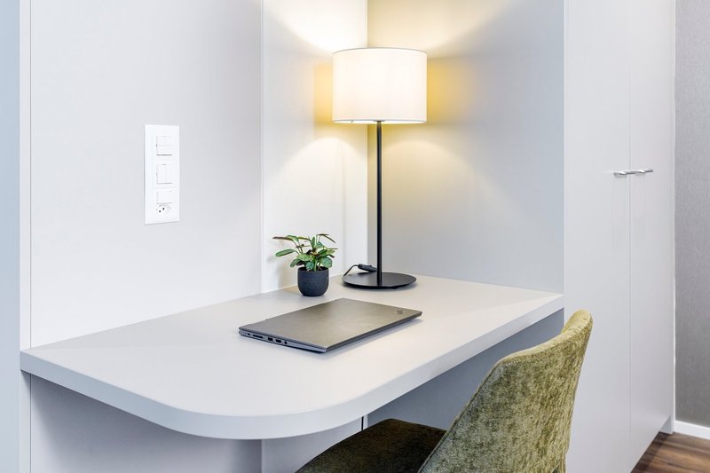Our Studio Apartments Suite everything you need for a comfortable stay in one room: a double bed (180×200 cm) with two bedside tables, plenty of storage space thanks to wardrobe and separate cloakroom, a desk, a seating area as well as a high-quality, fully equipped kitchen and a bright bathroom with a walk-in shower. The dining table invites you to linger.