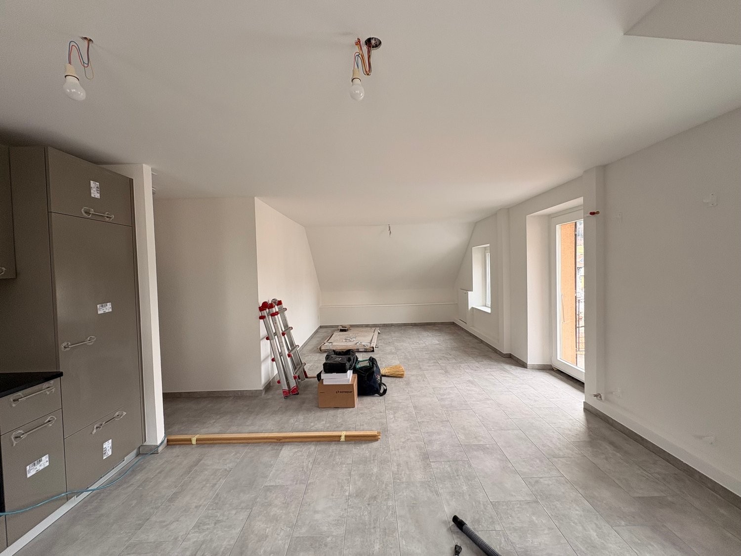 Cuisine équipée : Entièrement aménagée avec électroménagers et placards installés, sol gris élégant et lumière naturelle abondante, incluant un lave-vaisselle