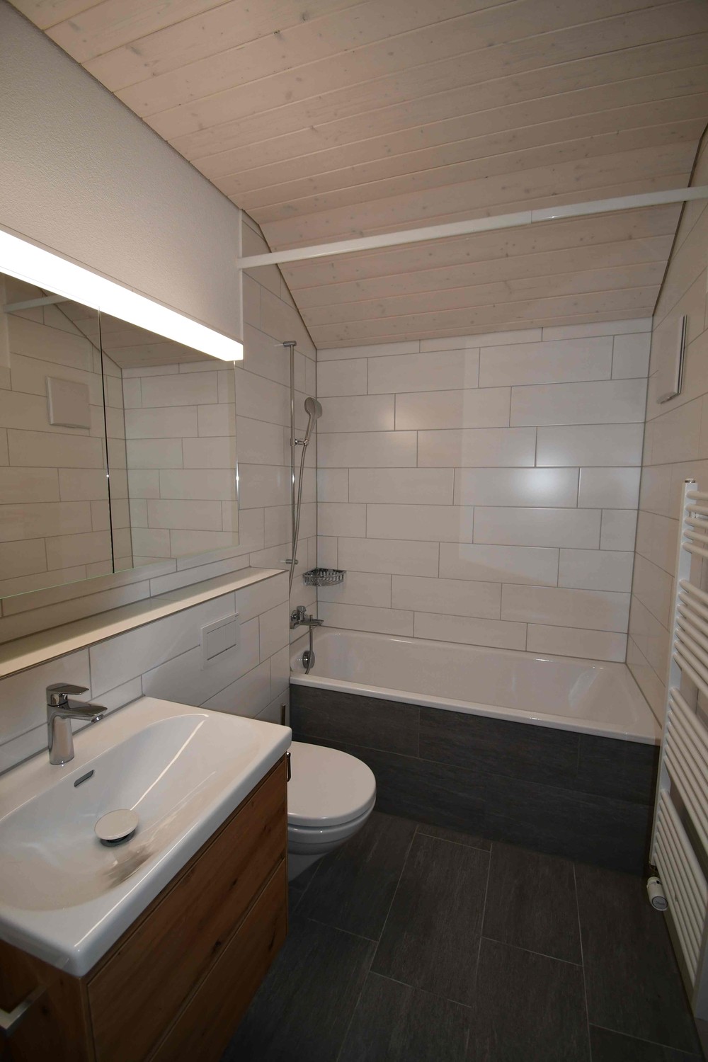Modernes Badezimmer mit Badewanne, WC, Lavabo mit Unterbau und hochwertigen Armaturen.