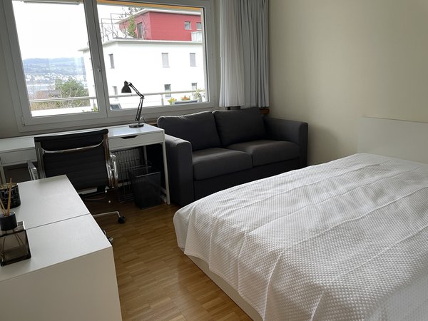 Ab 1. November 2025 oder nach Vereinbarung vermiete ich ein sehr schönes, ruhiges, helles, möbliertes Zimmer (ca. 16m²) mit Seesicht mit grossem Kleiderschrank und Sofa (in 4 1/2 Zi-Wohnung zu zweit). Nutzfläche für Untervermietung 78 m2!