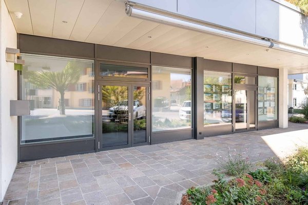 Belle surface de plain-pied dans un espace lumineux avec grandes vitrines sur la route principale.