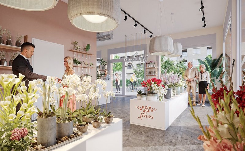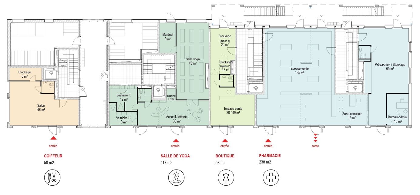 Les commerces et arcades se situent au rez-de-chaussée et permettent un accès direct aux visiteurs et clients et une visibilité maximale grâce à la promenade piétonne du Mail.