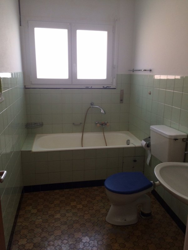 Badezimmer: Mit Badewanne, grünen Fliesen und praktischem Doppelfenster