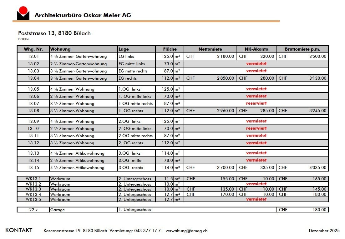 Da es sich um einen Neubau handelt, findet die Vermietung ab Plan statt. Eine Besichtigung der Wohnungen ist nicht möglich. Grundrisse, detaillierte Informationen zum Projekt sowie den ausführlichen Baubeschrieb finden Sie in der beigefügten Dokumentation.