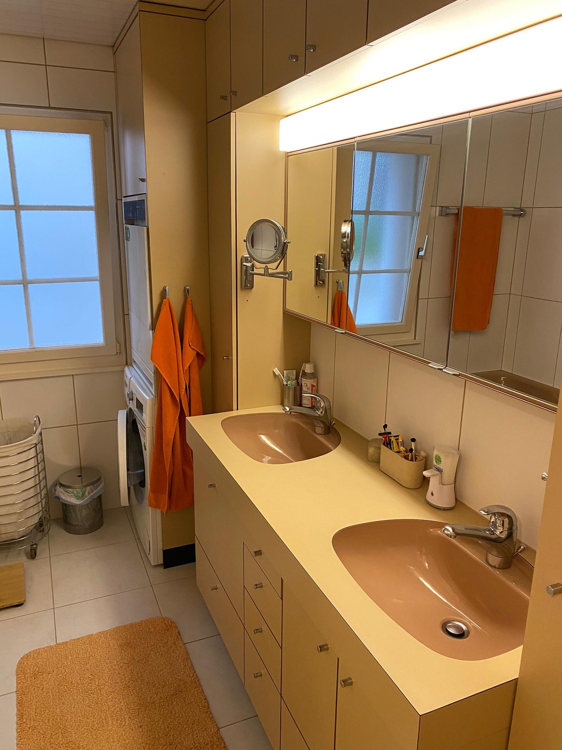 Sie hat eine moderne Küche mit Geschirrspüler und grossem Kühlschrank. Ein eigener Waschturm steht im Bad zur Verfügung.