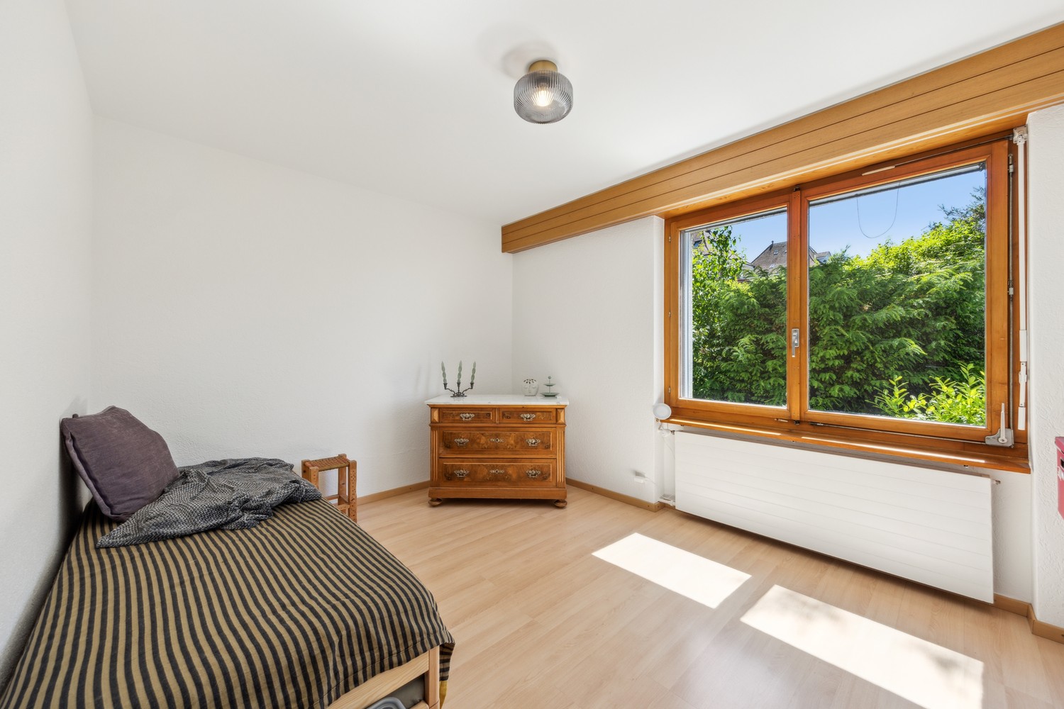 Die Wohnung wird aktuell komplett renoviert: sie wird frisch gestrichen, erhält einen neuen Parkettboden und eine neue Küche. Die hier publizierten Fotos sind von der Wohnung im 1. Stock und entsprechen nicht genau der Ausstattung der frei werdenden Wohnung. Die Aussicht und die Terrasse hingegen entsprechen der Realität.