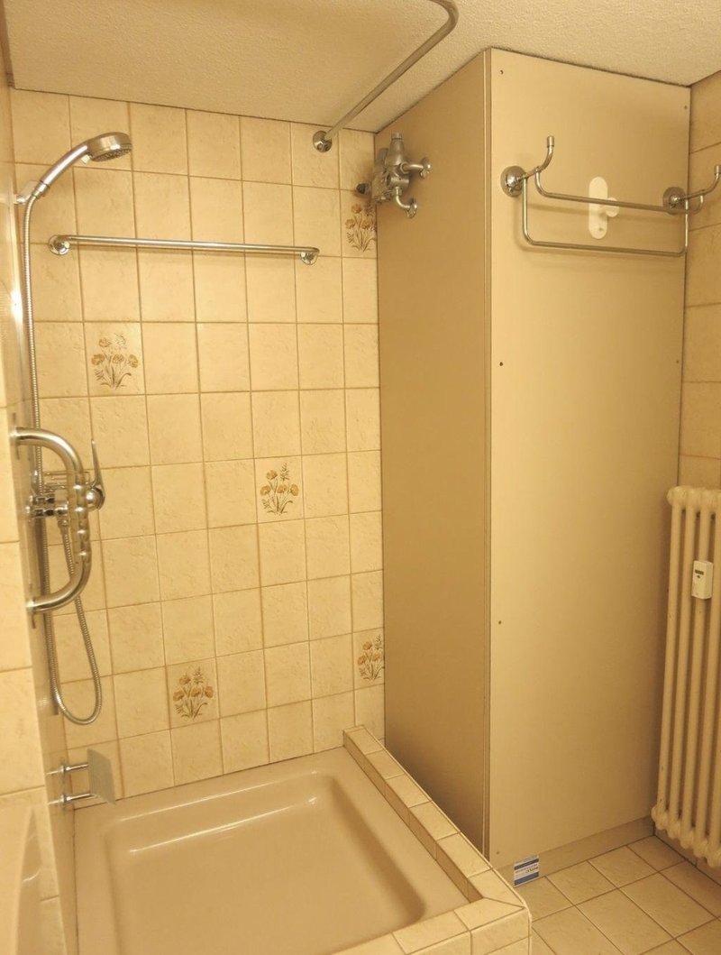 Bad mit Plättli, Duschwanne, Doppellavabo mit Unterbau und WC.