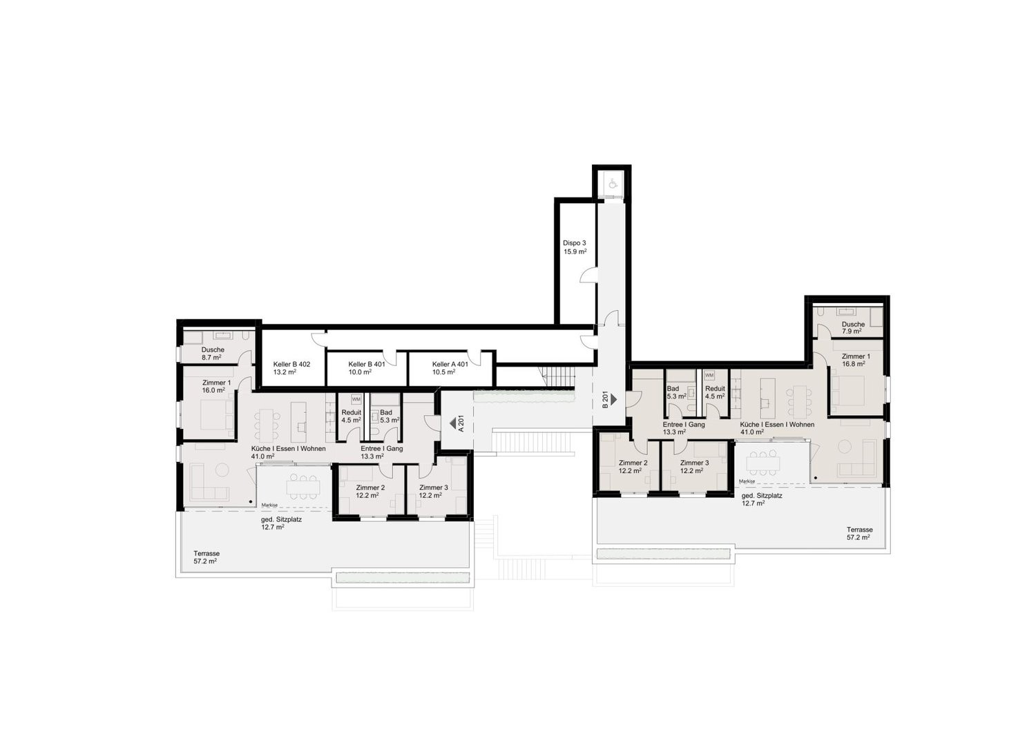 Ebene 2 - 4.5 Zimmer - NWF 113.2m² - Ged. Sitzplatz 12.7m² - Terrasse 57.2m² - CHF 925'000