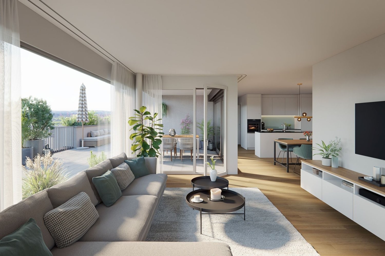 Die Terrassenhäuser zeichnen sich neben einem durchdachten, modernen Grundriss vor allem durch ihr grosszügiges Raumkonzept aus. Während sich sieben Terrassenwohnungen auf einer Ebene organisieren, ist die jeweils oberste Wohnung als Maisonette über zwei Etagen konzipiert. Alle Terrassenwohnungen verfügen über einen lichtdurchfluteten Wohn- und Essbereich, dessen Herzstück die offen gestaltete Wohnküche mit freistehender Kochinsel ist. Über eine Hebe-/Schiebetüre gelangt man von hier aus auf den überdachten Aussensitzplatz und auf die grosszügigen Terrassen, die einen herrlichen Blick in die Landschaft freigeben. In allen Räumen tragen ausgesuchte Materialien und hochwertige Apparate zum hohen Wohnkomfort bei.