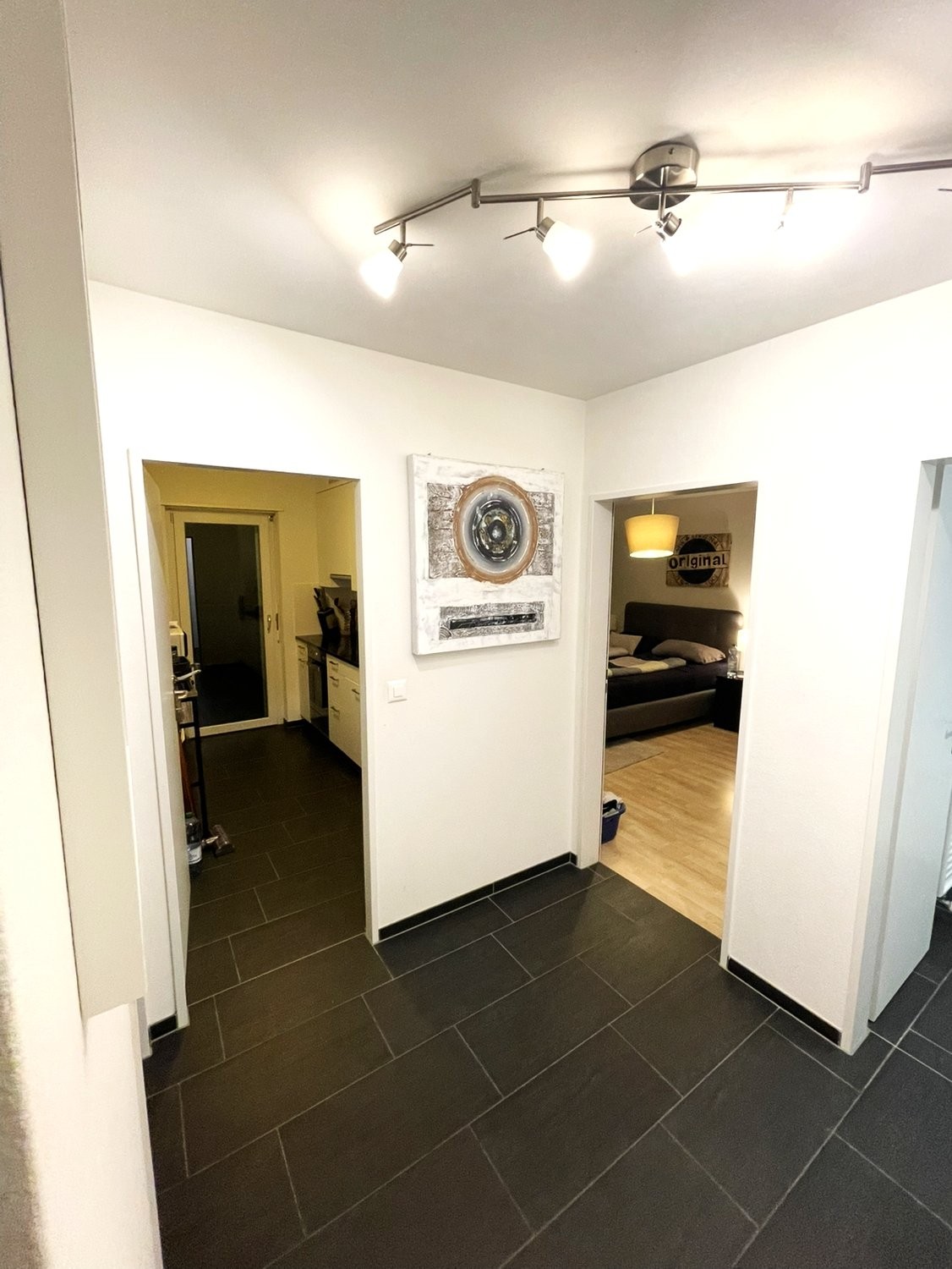 - dunkler Plattenboden im Wohnzimmer und Korridor / Parkettboden im Schlafzimmer