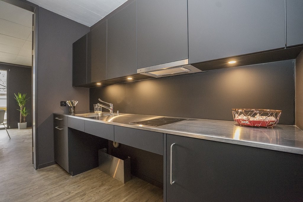 - offene Küche mit Glaskeramikkochfeld (ohne Geschirrspüler)