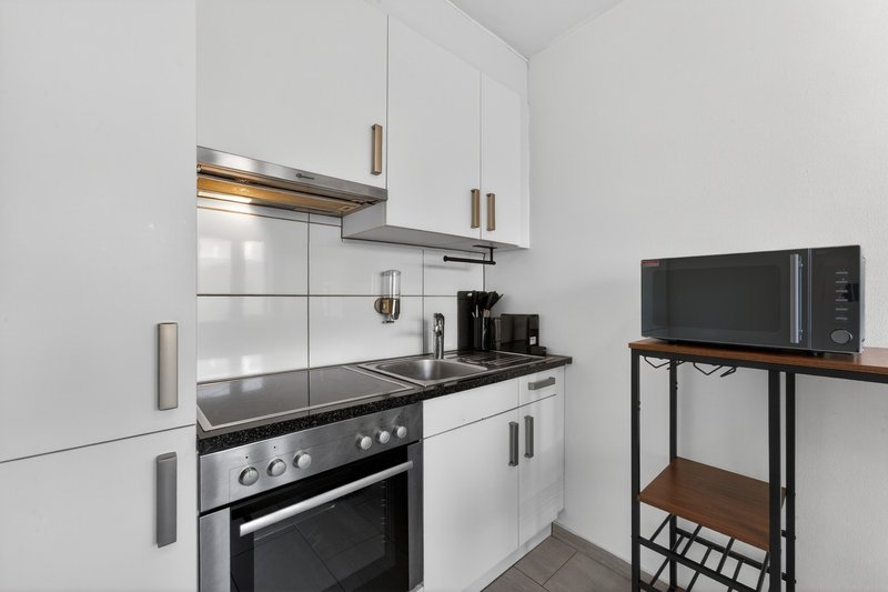 • Modern, fully equipped kitchen with cooktop, microwave, refrigerator and coffee machine