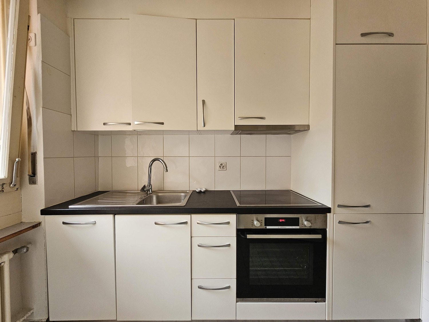 Praktische Küche mit Glaskeramik, Geschirrspüler sowie Schrankplatz und Platz für eine Sitzecke.
