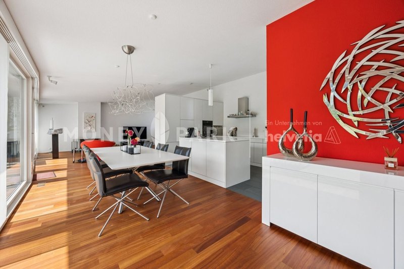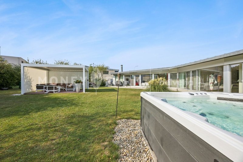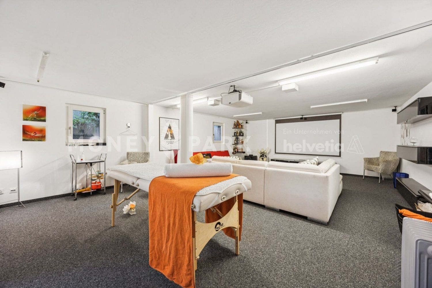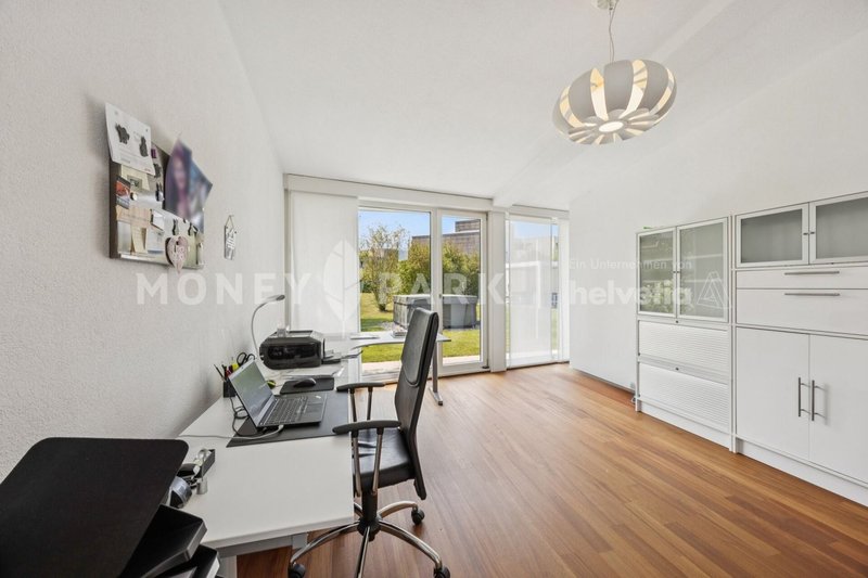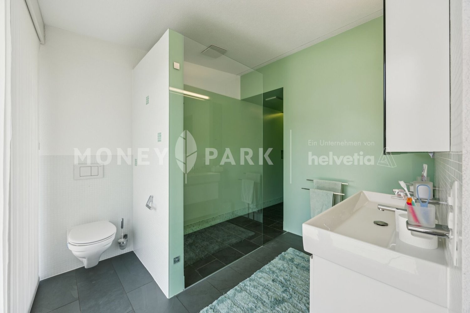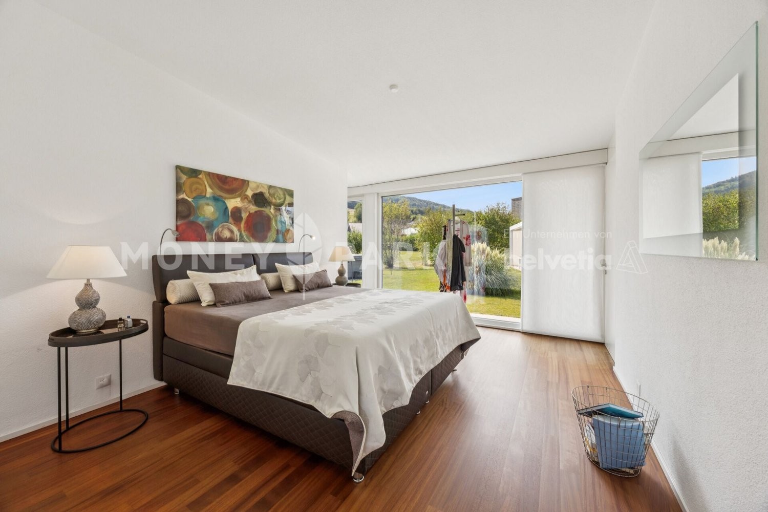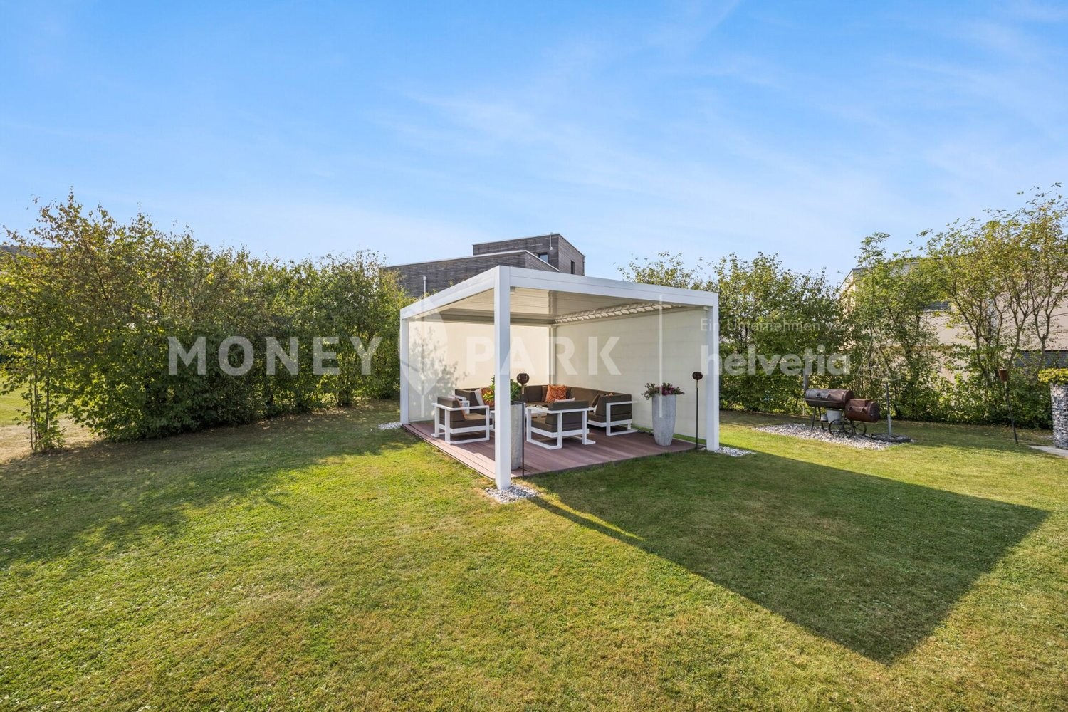 Dieser stilvolle Bungalow vereint moderne Architektur, hochwertige Materialien und ein durchdachtes Wohnkonzept. Mit 4.5 Zimmern (erweiterbar auf 5.5) bietet die Immobilie viel Raum für Ihre individuellen Wohnträume. Der lichtdurchflutete Wohnbereich mit Panoramafenstern schafft eine offene und einladende Atmosphäre, während die elegante Küche mit hochwertigen Geräten ideal für kulinarische Kreationen ist. Der Master-Bedroom mit Ankleide und direktem Zugang zum grosszügigen Badezimmer mit zwei Duschen sorgt für angenehmen Komfort. Im Sockelgeschoss erwartet Sie ein beeindruckendes Heimkino für unvergessliche Filmabende.