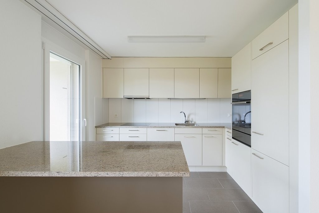 Offene Küche mit viel Stauraum und grosser Arbeitsfläche.