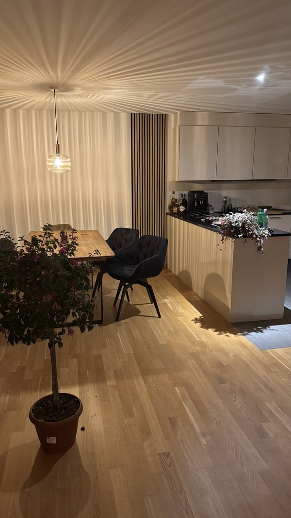 Die Wohnung hat 3.5 Zimmer ca 100qm und einen grossen Garten der um die Wohnunh herum geht.Jedes Zimmer hat separaten Gartenzugang. 2 Bäder, gereinigt alle 2 Wochen von externer Reinigskraft.