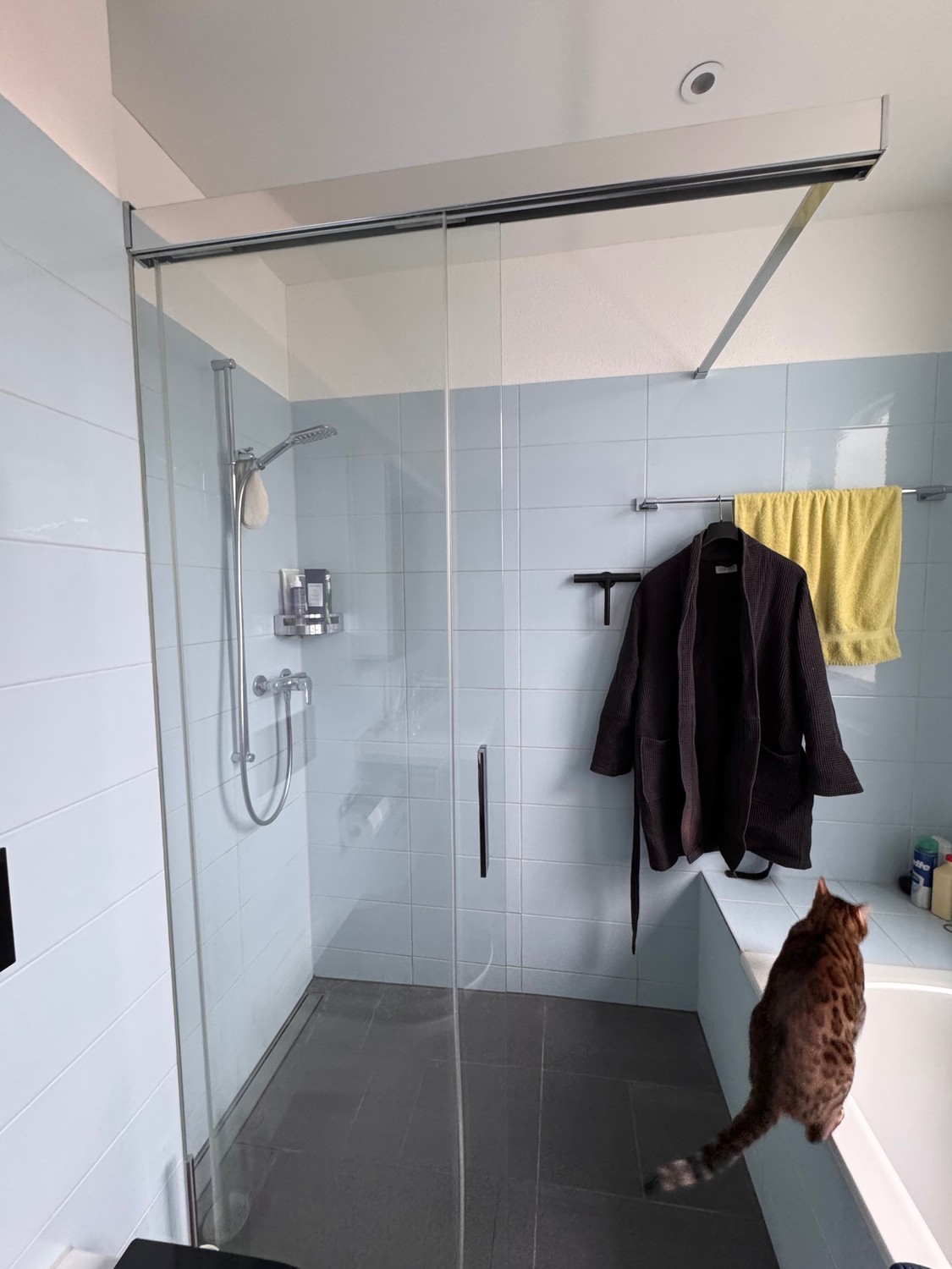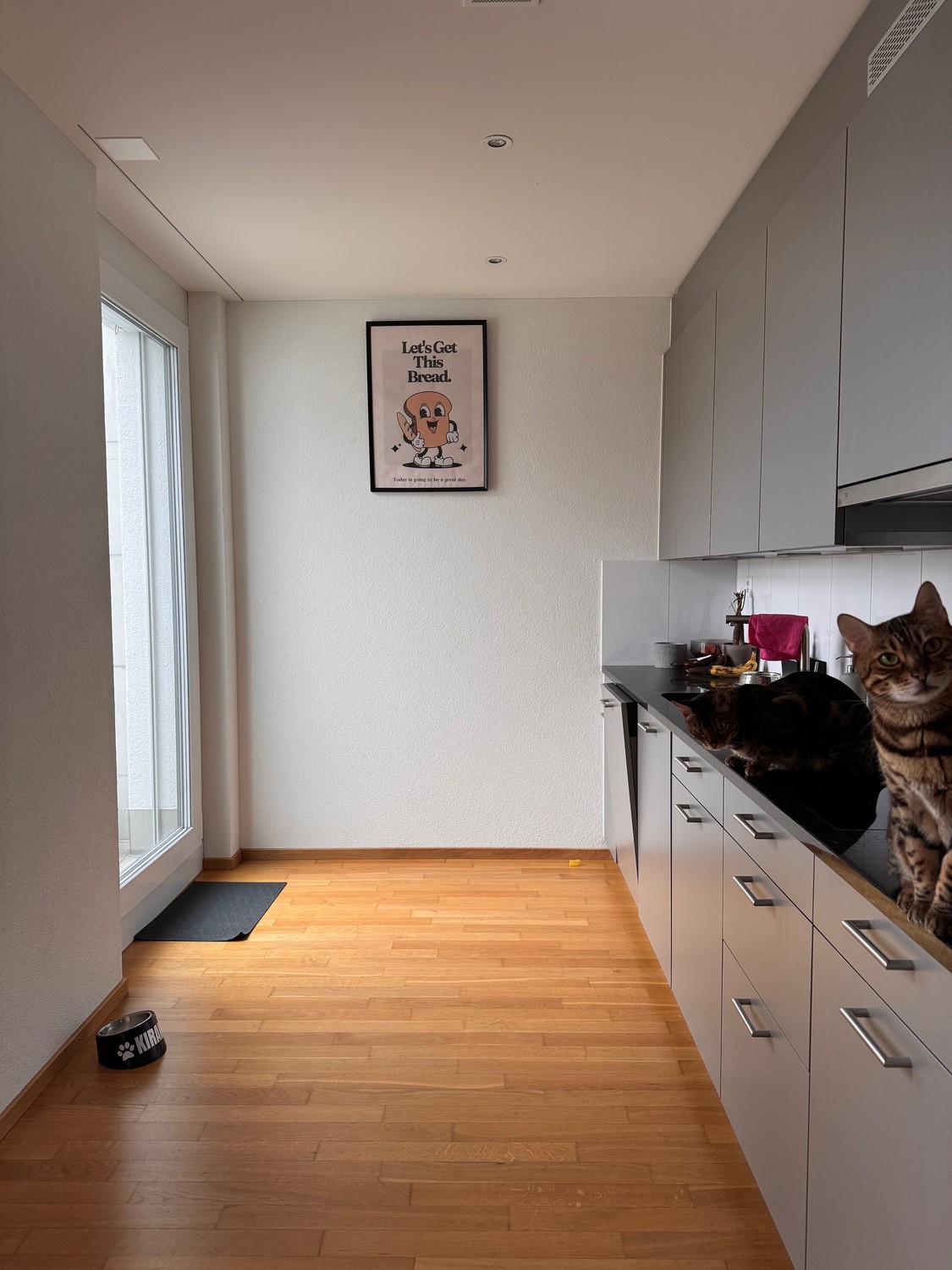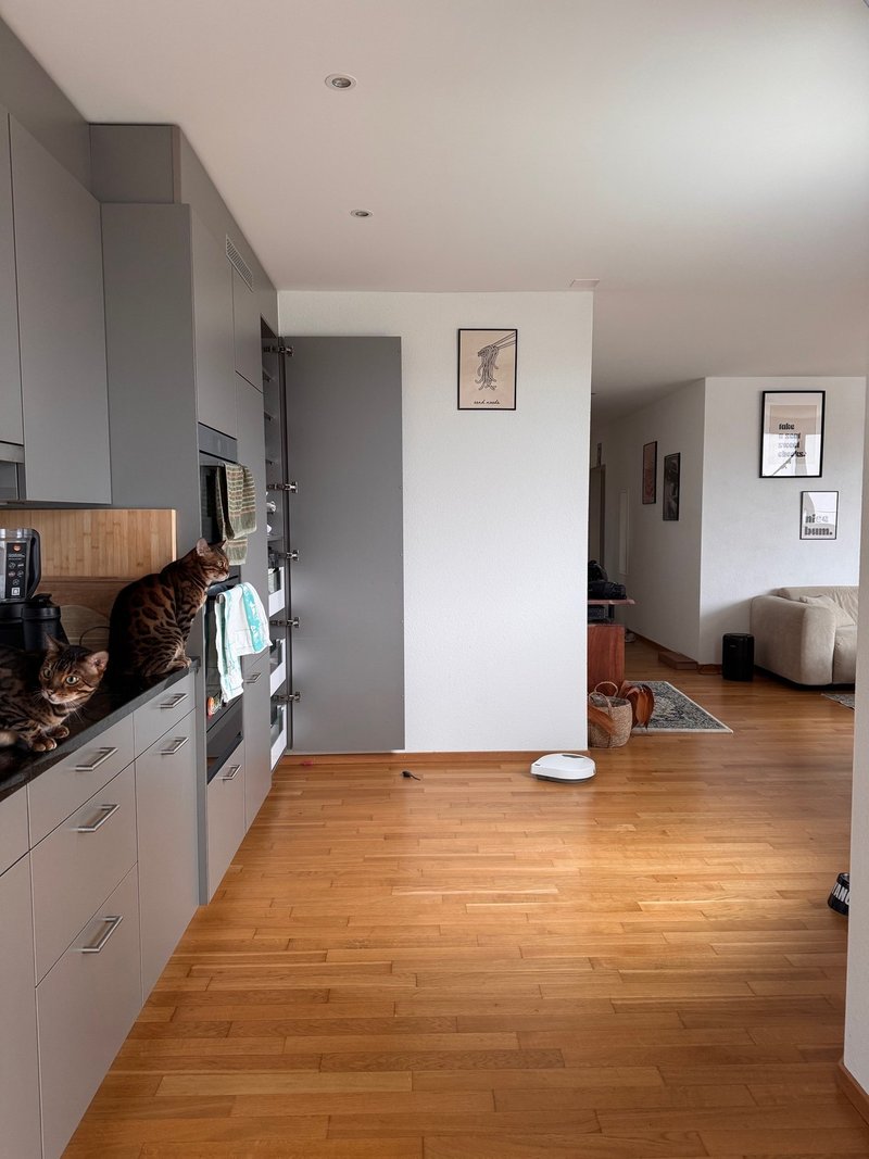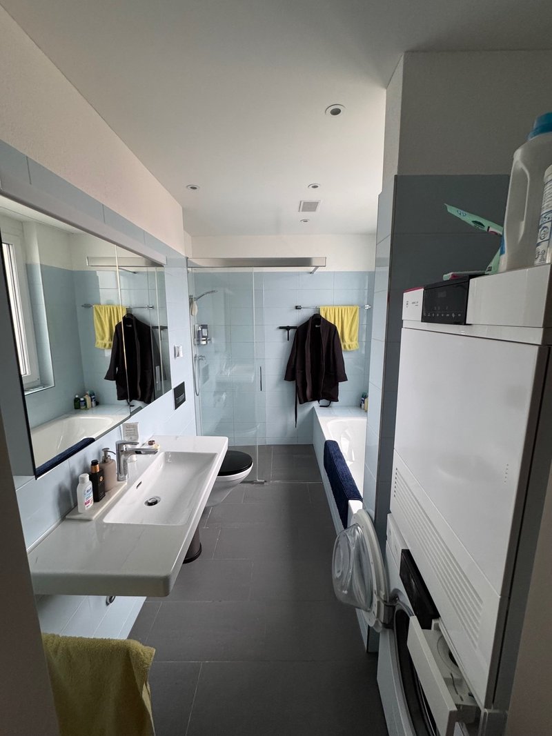 Die Küche ist mit hochwertigen V-ZUG Geräten ausgestattet und bietet viel Stauraum. Das Badezimmer verfügt sowohl über eine Badewanne als auch über eine begehbare Dusche. Zusätzlich steht ein eigener Waschturm (Waschmaschine & Tumbler, ebenfalls V-ZUG) in der Wohnung zur Verfügung.