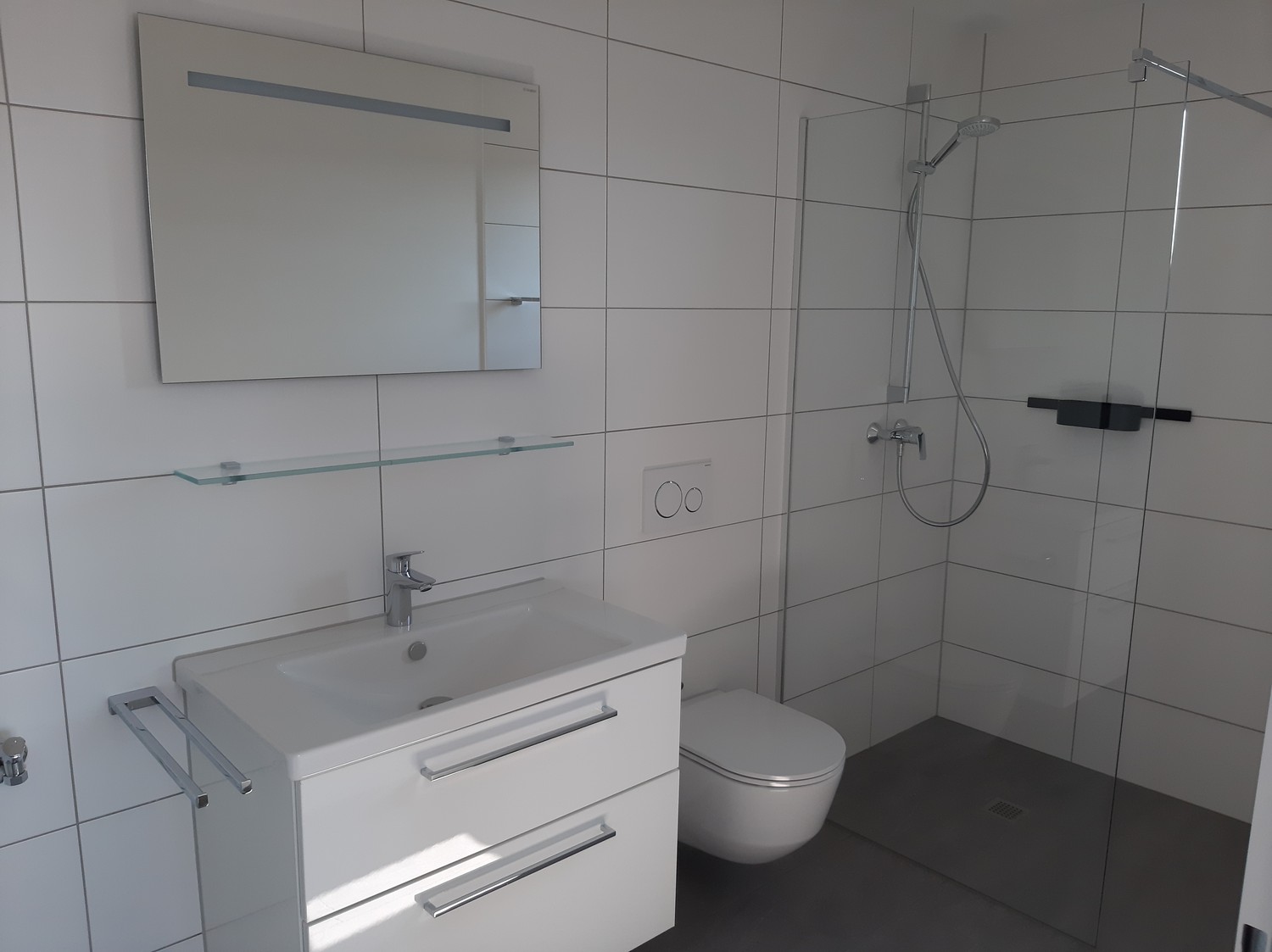 bodenbündige Dusche, Feinsteinzeug, Waschtisch mit Unterkasten und Spiegel, WC