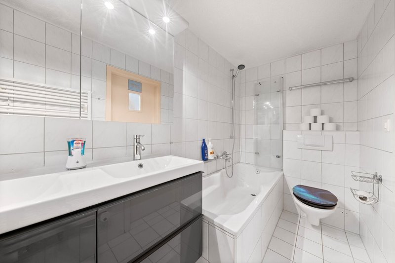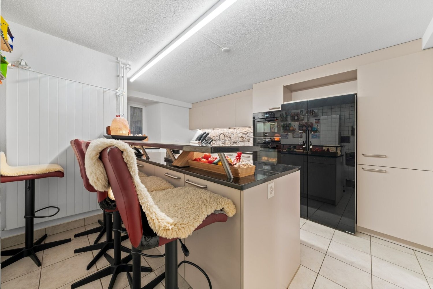 Die neue, moderne Küche mit Kochinsel, Bar und hochwertigen Geräten lässt keine Wünsche offen. Die freigelegte Bruchsteinmauer macht sie zu einem echten Blickfang. Das Badezimmer überzeugt mit ergonomischer Badewanne und Doppelwaschbecken. Ein besonderes Detail ist das Fenster mit Blick in den Stall - so haben Sie Ihre Tiere jederzeit im Blick. Waschmaschine und Trockner sind modern, grosszügig dimensioniert und komfortabel.