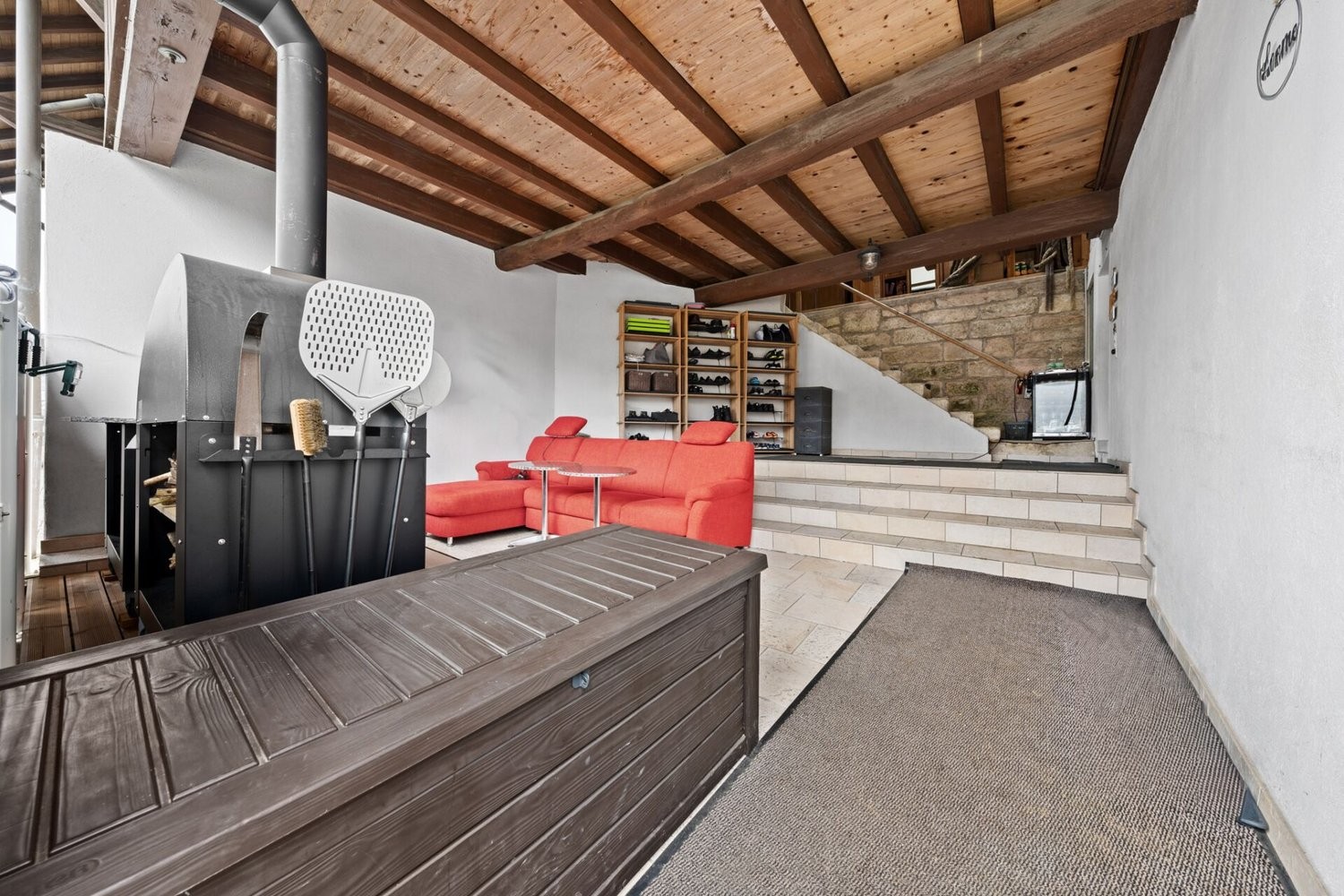 Der einladende, grosszügige Eingangsbereich bietet Raum für individuelle Nutzungskonzepte. Der Wohnbereich erstreckt sich über zwei Etagen mit rund 140 m² Wohnfläche. Das gemütliche Wohnzimmer mit gepflegtem Holzofen vermittelt sofort ein Gefühl von Zuhause.