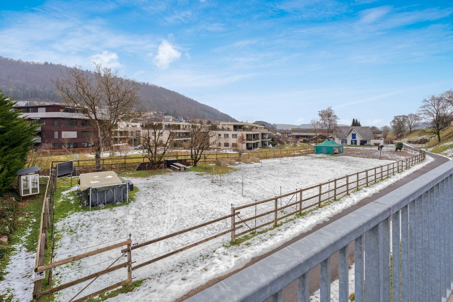 Die dazugehörige Weide mit der Parzellen-Nr. 138 ist auf ca. 2239m2 Landwirtschaftsland. Ein Teil davon ist ein Allwetterplatz mit befestigtem Boden und Rundkiesbelag.