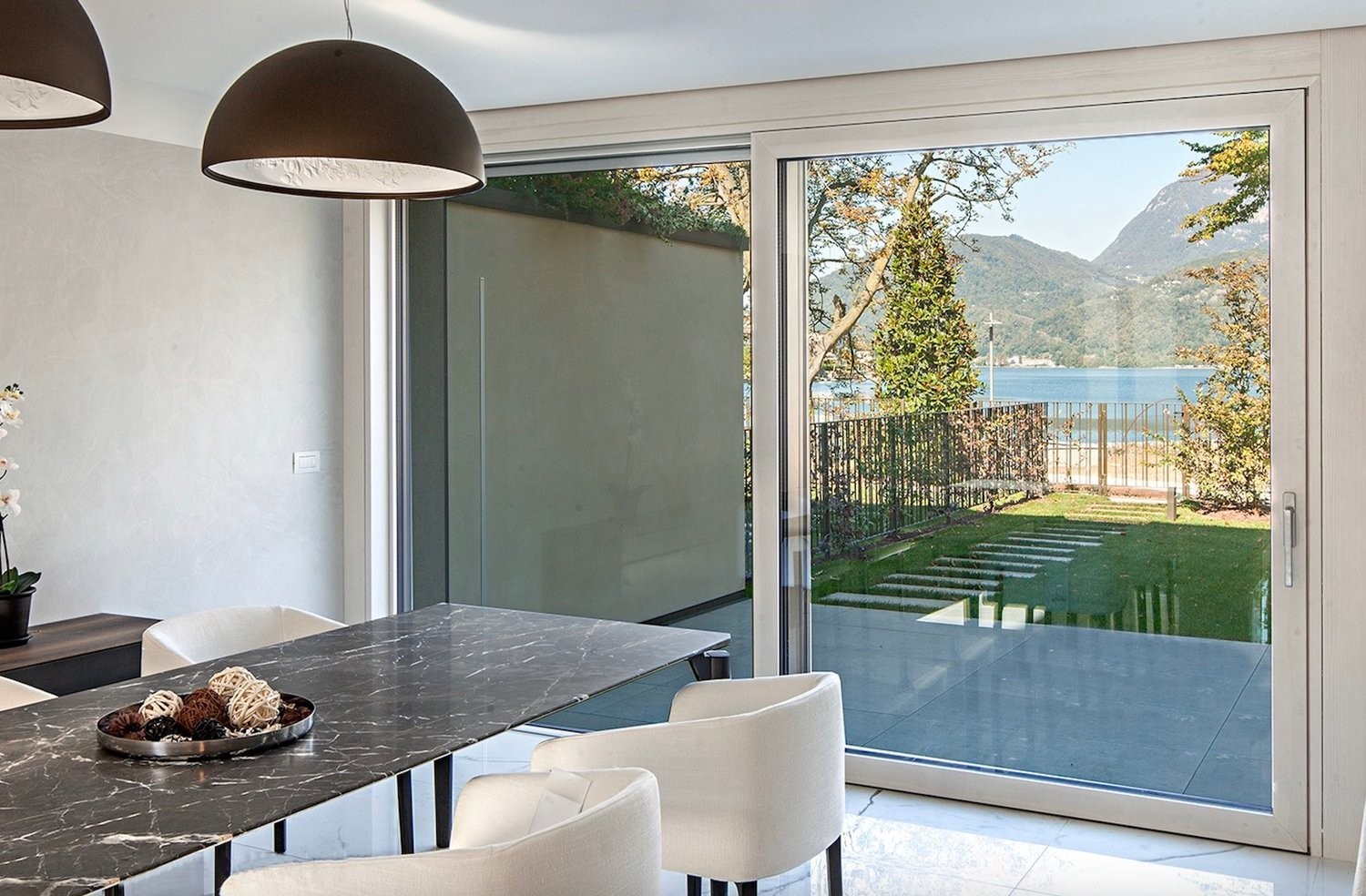 - Ampio e luminoso soggiorno e sala da pranzo con affacio sul giardino privato e sul lago