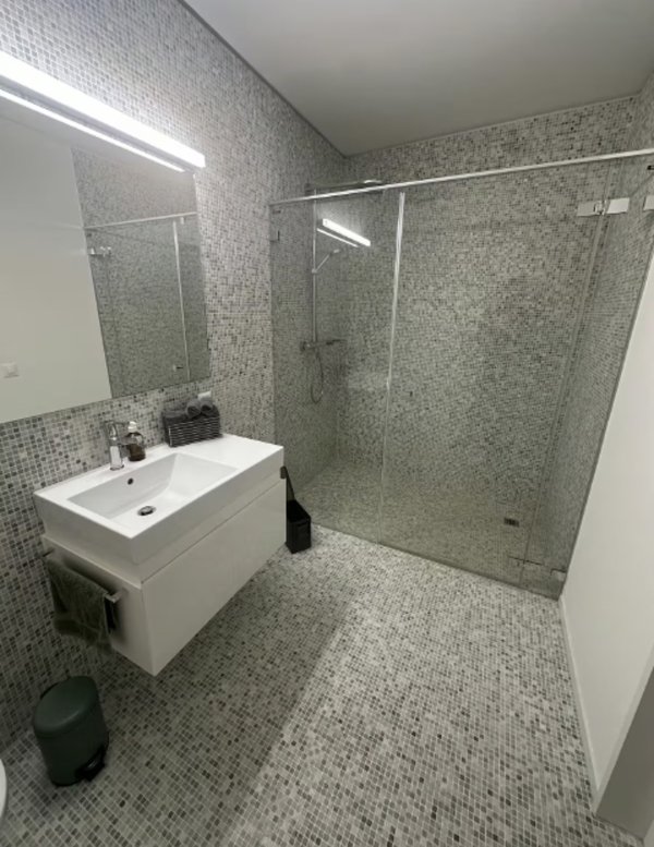 ● 2 moderne Bäder: Stilvolle Ausstattung mit grauen Fliesen, weissen Arbeitsplatten und gläsernen Duschkabinen