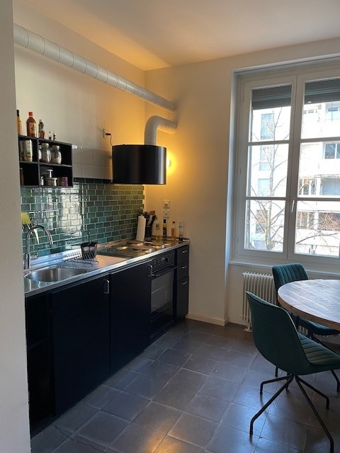 Moderne Küche: Ausgestattet mit grünen Fliesen, Edelstahlgeräten und einem grossen Fenster, das viel Tageslicht hereinlässt