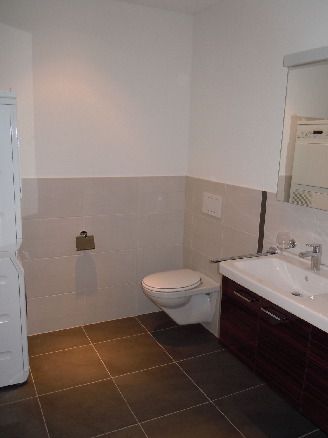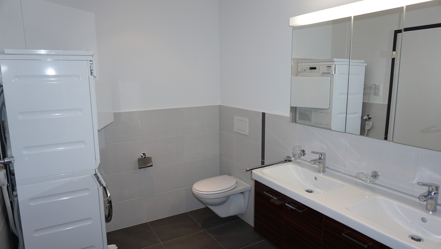 *eine eigene/n Waschmaschine und Wäschetrockner im Badezimmer.