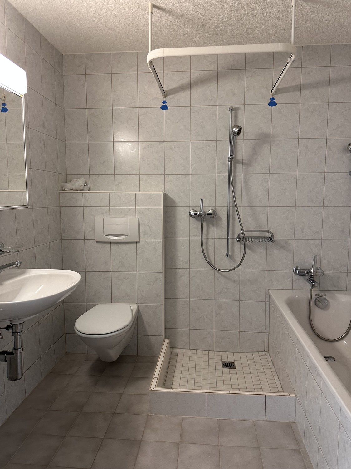 Praktisches Badezimmer: Dusche UND Badewanne gefliest, mit WC und Lavabo.