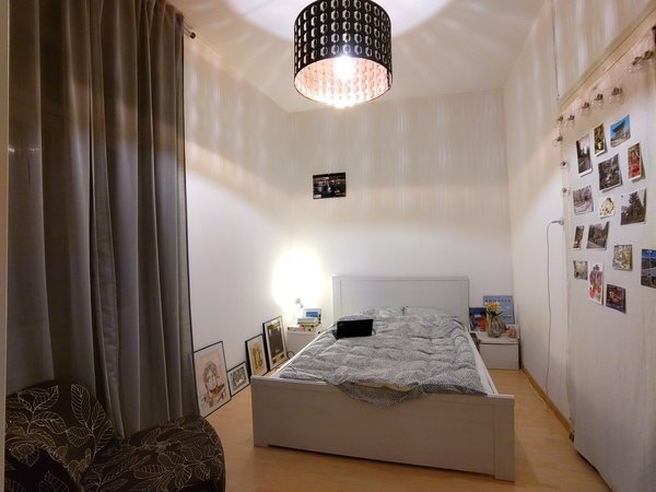 Das Zimmer ist nicht riesig (ca. 12m2), dafür sehr ruhig gelegen auf der Seite des Innenhofs. Die Möbel (Bett 140x200cm, Schrank, Sessel) können gratis übernommen werden.