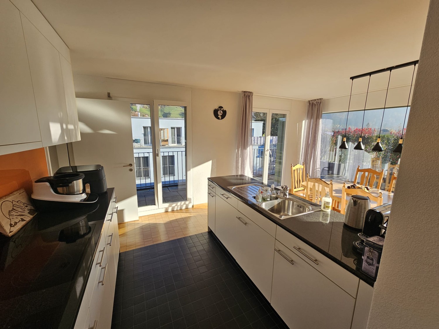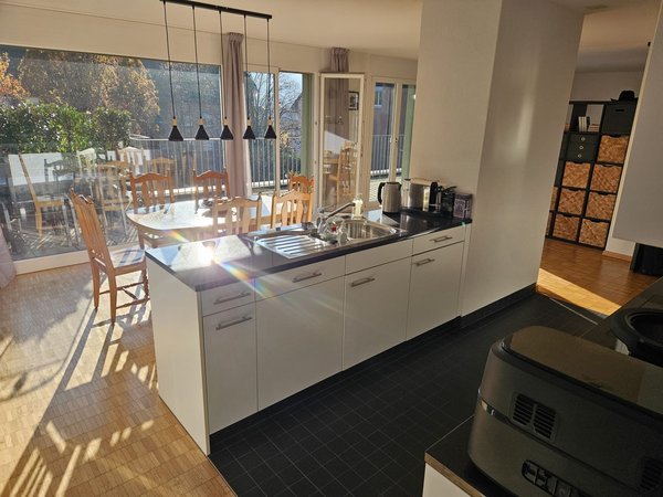 Küche Moderne Küche mit zeitgemässen Geräten und direktem Zugang zur Terrasse. Balkon & Terrasse Ein grosser, umlaufender Balkon bietet viel Aussenfläche und einen freien Blick auf die Berge. Badezimmer & Waschküche Zwei Badezimmer – eines mit Dusche, das andere mit Badewanne. Die Wohnung verfügt über eine eigene Waschmaschine und einen Tumbler. Parkplatz & Gebäude Ein Garagenparkplatz ist im Mietpreis inbegriffen. Der Parkplatz soll vom neuen Mieter übernommen werden; er kann mit einer Kündigungsfrist von drei Monaten aufgehoben werden, wodurch sich die Miete um CHF 120 pro Monat reduziert. Das Gebäude verfügt über Liftzugang, ist rollstuhlgängig und haustierfreundlich. Für Kinder steht ein Spielplatz zur Verfügung.