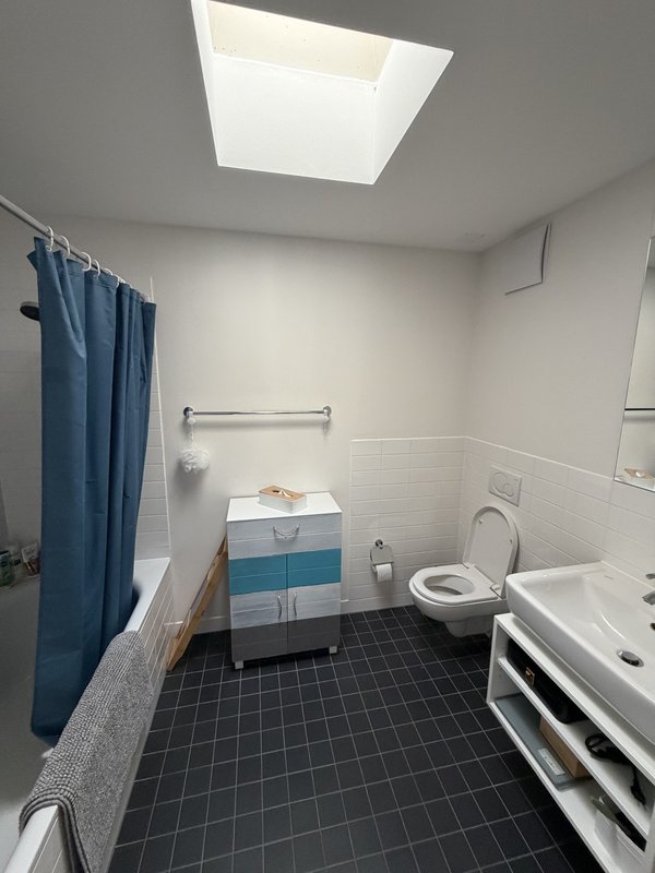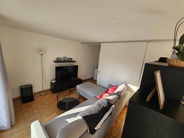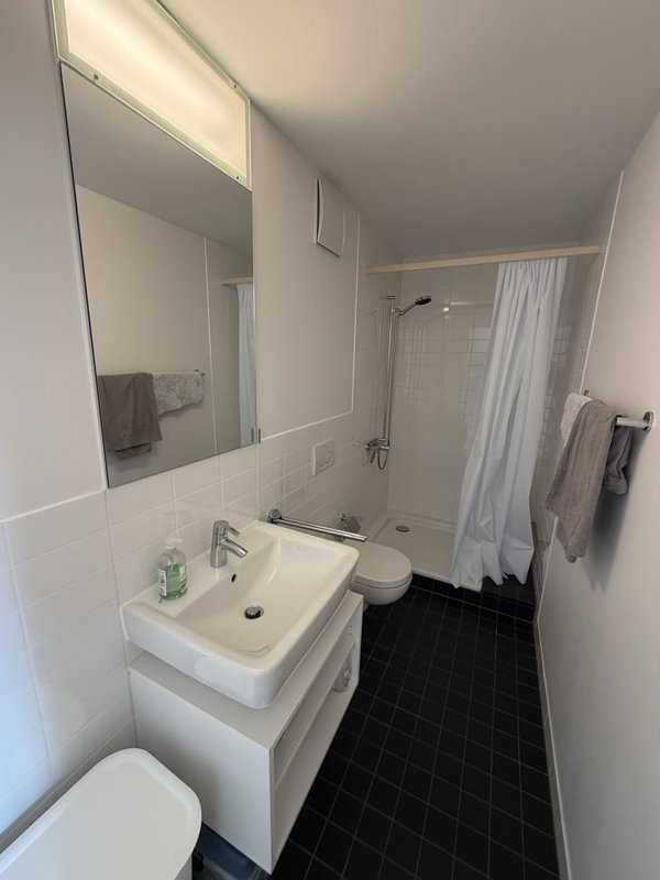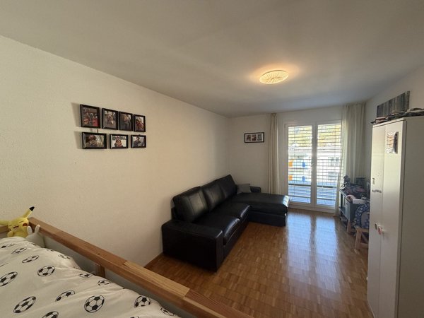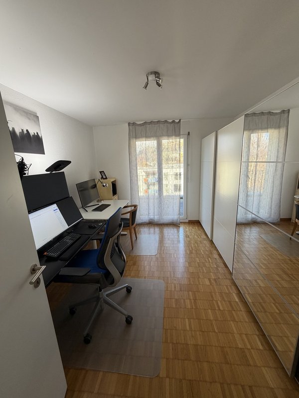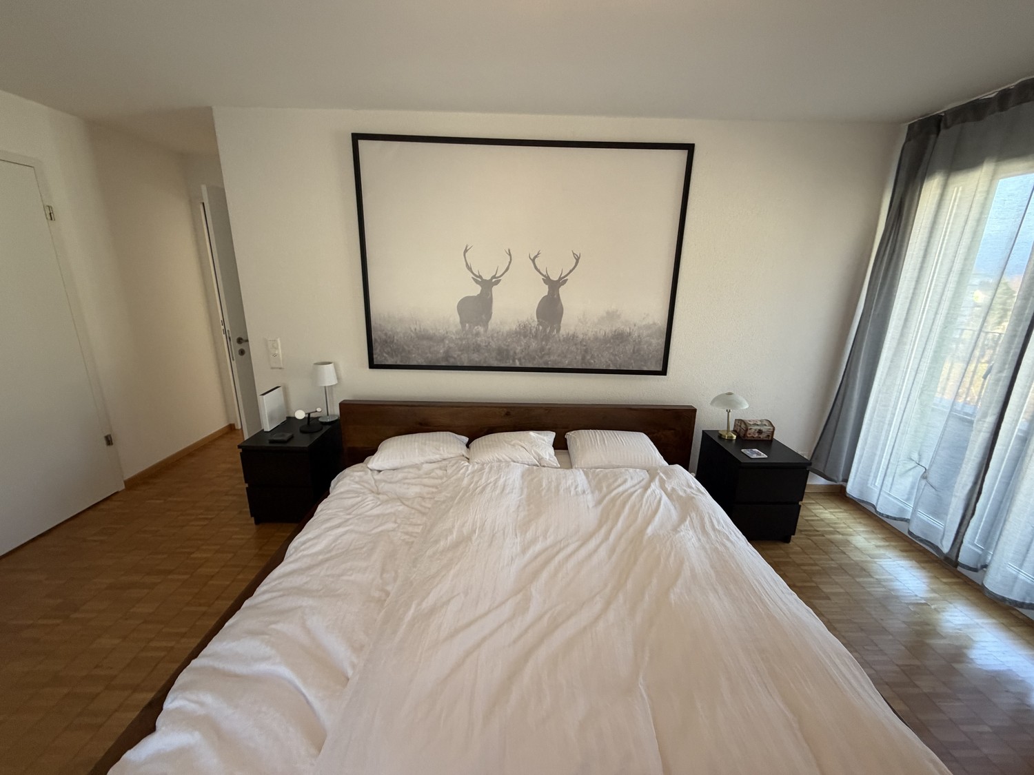 Kitchen Modern kitchen with contemporary appliances and direct access to the terrace. Balcony & Terrace A large wraparound balcony provides generous outdoor space with unobstructed mountain views. Bathrooms & Laundry Two bathrooms – one with a shower and one with a bathtub. The apartment includes a private washer and dryer. Parking & Building A garage parking space is included in the rent. The new tenant should be able to take over the parking space; it can be canceled with three months’ notice, which would reduce the rent by CHF 120 per month. The building has elevator access, is wheelchair accessible, and pet-friendly. A children’s playground is also available for residents.