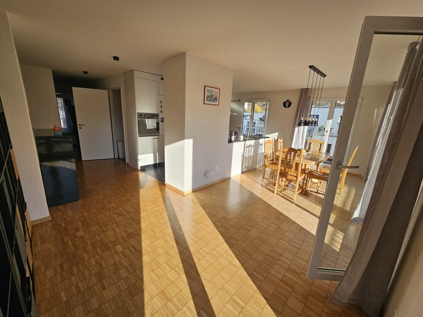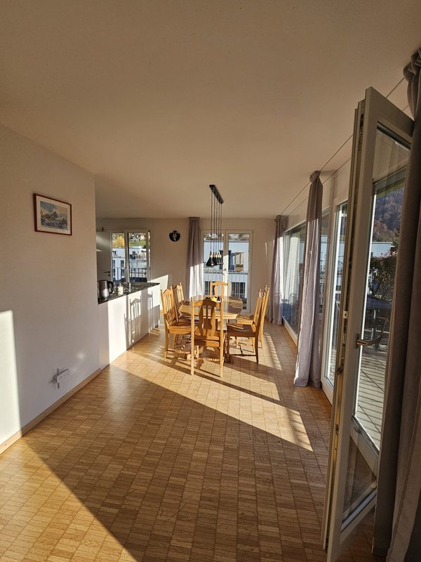 We are looking for a new tenant (Nachmieter) for our 4.5-room roof apartment on the 3rd floor. The apartment offers 119 m² of bright living space in the quiet village of Mollis, combining modern comfort with open views of the surrounding mountains. It is ideal for families or professionals looking for a peaceful home close to nature. Features Living & Dining Area Spacious open-plan living and dining area with heated hardwood floors and large windows.