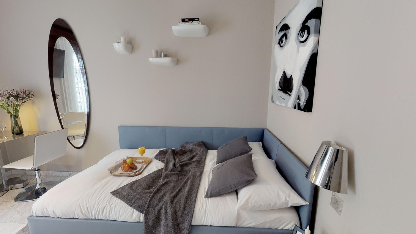 This small but fine studio offers everything one may desire in a place to live. Natural materials and subtle brown tones fill the apartment with an aura of charming elegance. The open living and sleeping area features seats, flat screen TV (tax for the use of TV not included in the rate) and a snug double bed to relax. The kitchenette is fully fitted and caters for all the daily needs offering a glass ceramic stove, microwave, coffee maker, as well as pans, crockery and cutlery. The separate bathroom with a shower offers a hair dryer, hand towels, as well as company-branded toiletries.