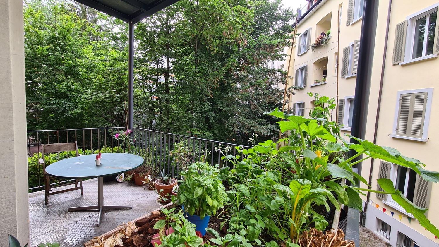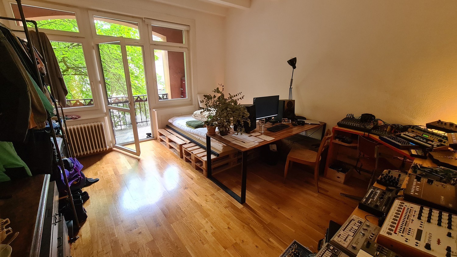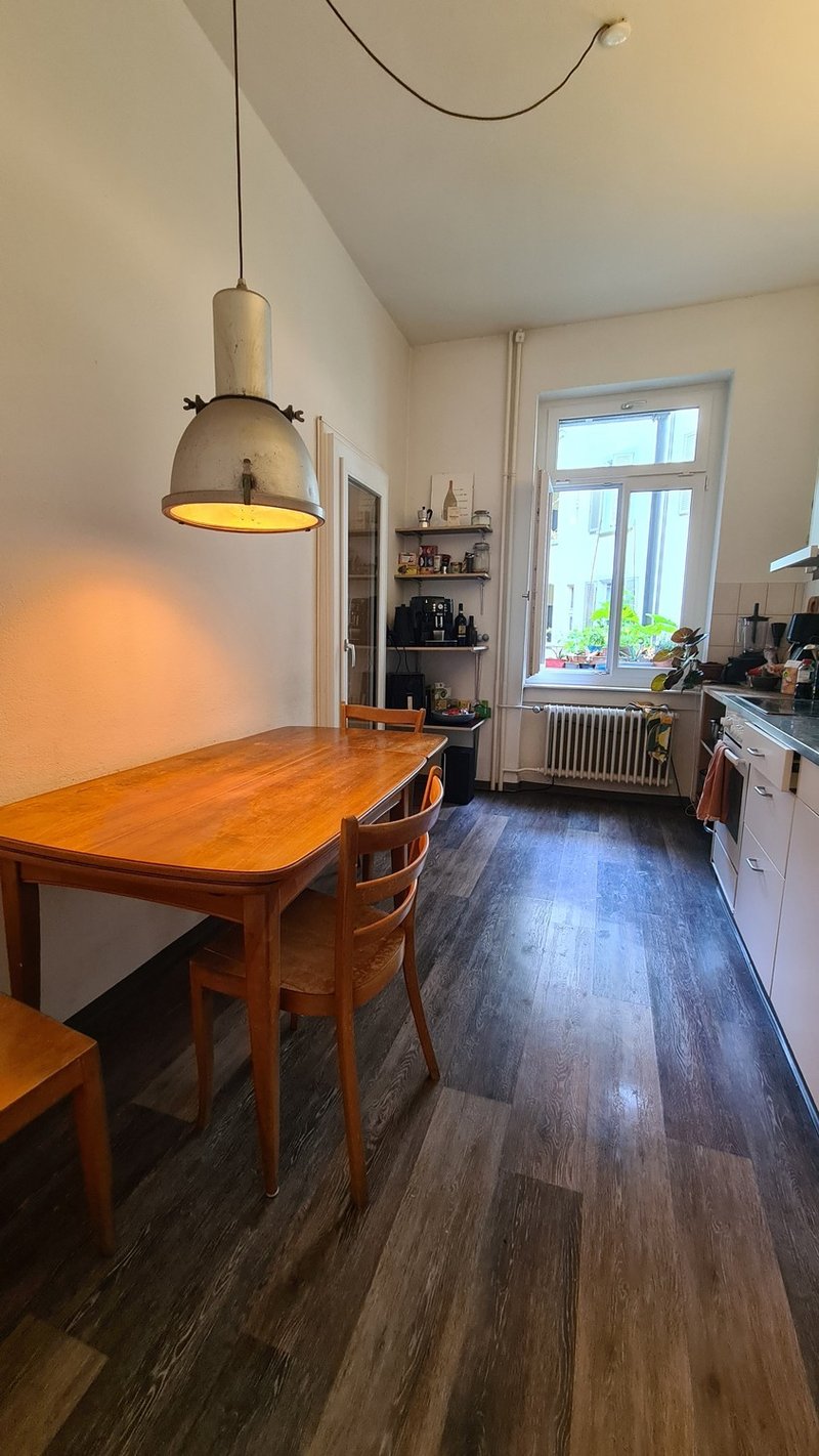 23m2 room with private balcony in shared apartment (140m2, 3.8m ceiling height) at central location between Letten & Schaffhauserplatz. You'll have two other roommates (male, mid 30s), a living room, a spacious kitchen and a large courtyard balcony as well as access to a communal roof-top with a 360° view. We are an easy-going, self-reliant and organised/clean household. Room comes with a large desk and screen ideal for home-office, a 160x210 Japanese futon and open closet space.